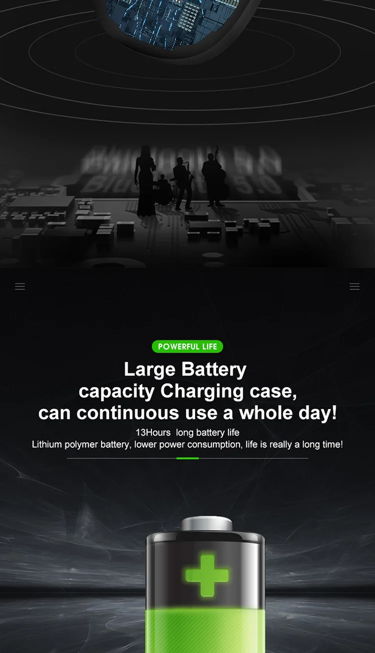 8D объемный звук, 5,0 два наушника, большая емкость, беспроводная гарнитура Bluetooth Графен басовая диафрагма, Hi-Fi высокочастотная технология, 10 мм динамический динамик Два способа подключения: один/двойной, бесплатный в использовании, один слуховой аппарат для прослушивания одним ухом, прослушивание Hi-Fi стерео в двух ушах. Бинауральный вызов HD, Автоматическое Сопряжение с ботинкой на 5,0, Встроенный активный микросхема шумоподавления Функция: стерео, голосовой ассистент, номер звонка и т. д.