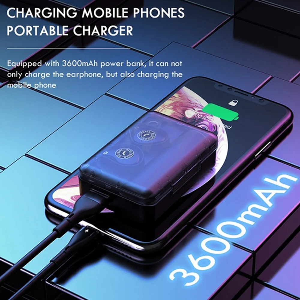 ●Product Name: Xsplus ●Charger Box Battery:3600mAh ●Earphone Battery:50mAh ●Bluetooth version: second generation Bluetooth 5.0 ●Music / call duration: 4-6 hours ●Waterproof: IPX7 life waterproof ●Charging box can charge the headset: 6-7 times ●Sensitivity: 123dB ●Impedance: 32Ω ●Bluetooth transmission distance: about 10m