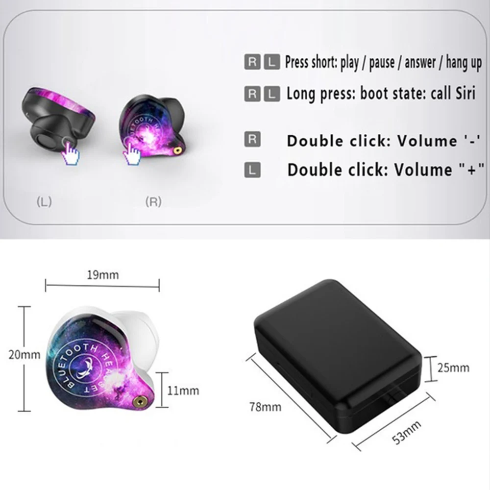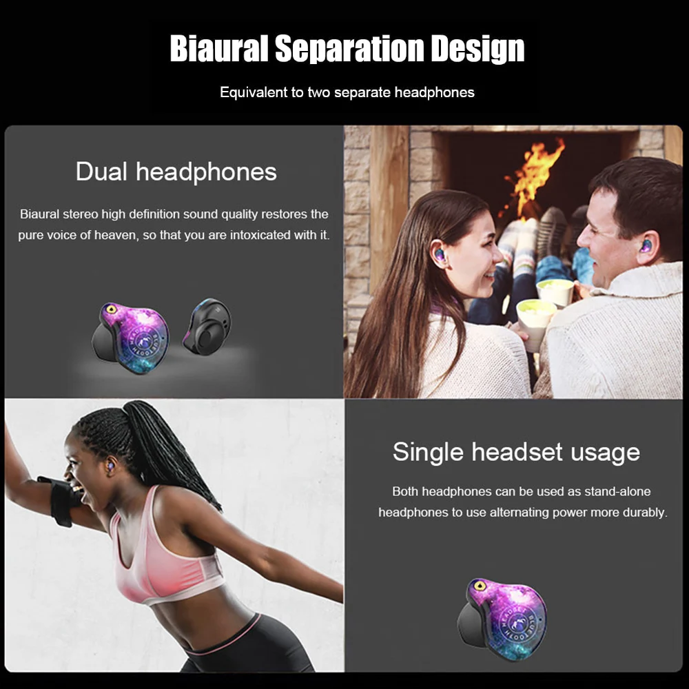 8D surround sound, 5.0 two-ear chip, large capacity, true wireless Bluetooth headset. Graphene bass diaphragm, HIFI high-frequency technology, 10MM dynamic speaker unit. Two connection methods: single / double free to use, single ear listening to enjoy alone, listening to HiFi stereo in both ears. Binaural HD call, 5.0 automatic boot pairing, built-in active noise reduction IC. Function: binaural HD call, play pause, answer hang up, reject call, end number replay, summon Siri, up and down song switching, automatic pairing.