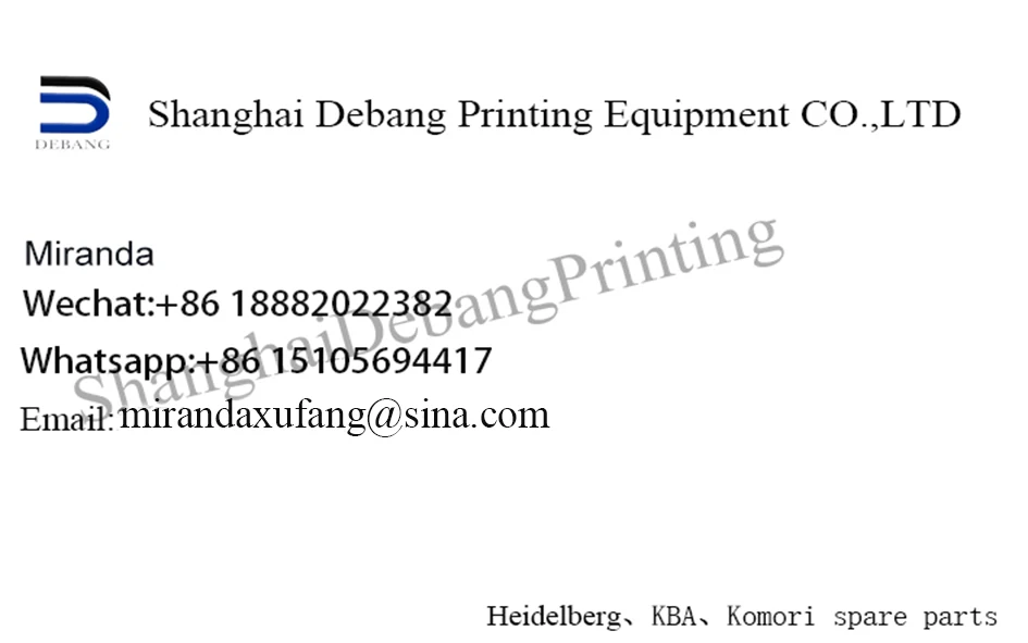 Shanghai Debang полиграфическое оборудование обратную связь о том, что вы хотите, Ltd. является долгосрочной перспективе поставщиком для нанесения печати по фольге части решений с 20-летним стажем. Мы можем предоставить оригинальные детали для наших клиентов, оригинальные разобранные второй части, оригинальные импортные запасные части и китайские соответствующие части. Наша компания поставляет большое количество товаров. Одна из крупнейших и наиболее полных компаний оборудования в Китае.