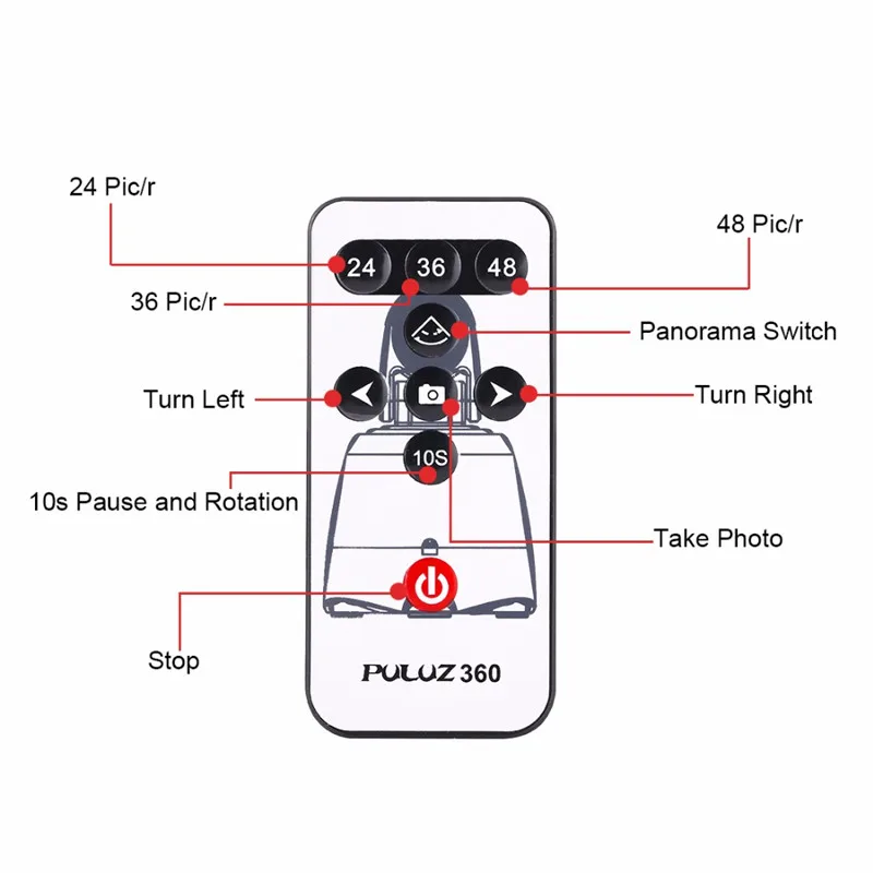 2. Панорамная головка управляется поставляемым инфракрасным контроллером вместо смартфона. База имеет только переключатель включения/выключения питания. Пульт дистанционного управления может быть сопряжен с вашим смартфоном через Bluetooth, учитывая, что система смартфона выше Android 3,0 или iOS 4,0. Сделайте Панорамное изображение, нажмите кнопку захвата фотографий на пульте дистанционного управления, чтобы запустить смартфон. (Примечание: функция захвата пульта дистанционного управления используется только для управления телефоном, чтобы делать снимки, недоступна для съемки видео, режим видео только для угла поворота)