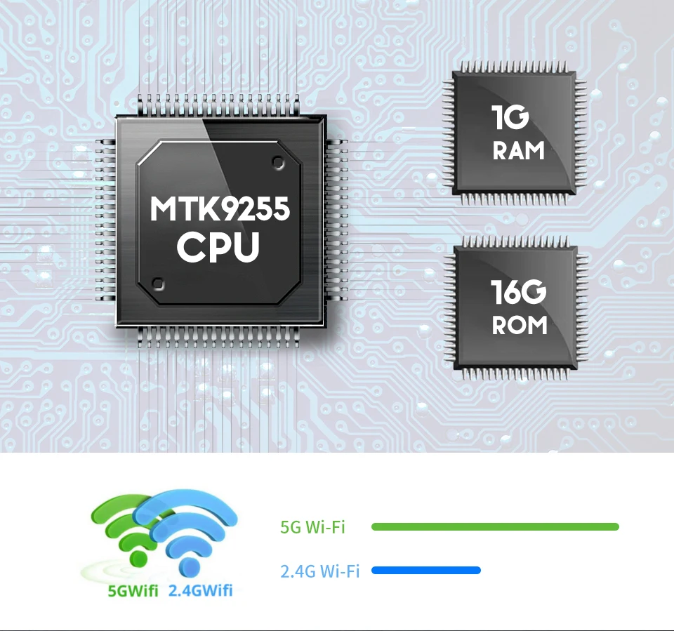 Встроенный 2,4G/5G Wifi ,BT 4,2, 1 + 16GBПоддержка загрузки приложения, онлайн-фильмов, игр,Добро пожаловать в более умный способ смотреть.
