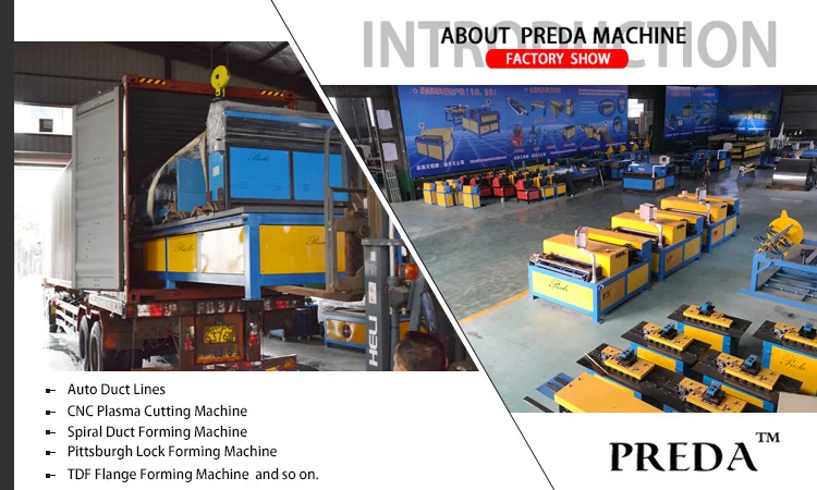 1. How to get a accurate quotation from Preda Machine? Provide the machine name you want, the specifications you need and the quantity of machine, we shall quote accordingly! 2. What's the shipping cost from China to your country? Please kindly tell us your nearest port to your place. We have reliable shipping forwarder to insure cheap, safe, convenient and timely delivery via sea. 3. Payment terms, MOQ, warranty, FOB. Payment terms: 20% TT paid in advance, the balance of 80% before the shipment. Minimum order quantity: 1 set of any machine of Preda Machine. Delivery time : 5days after order confirmation. As a real manufacturer, we normally stock our machine in at least 5-10 sets including auto duct line 5, auto duct line 3, auto duct line 2! And at least 20 sets each for TDF flange forming machine, Pittsburgh lock former, TDF folding machine, Pneumatic folder and etc... Shipping terms : FOB, CFR, CIF and etc.. according to your requirements. Warranty:24 months after our machines arriving at you. 4. What's the package? Fumigation-free plywood case for LCL and nude package for full container basis such duct production line 5, duct auto line 3, duct line 2... 5. What about commissioning service? We can offer commissioning service, the buyer need to pay for all the transport, salary, hotel, meals for Preda Machine technicians caused during the service period. 6. What's policy for guarantee and broken parts? Warranty period of equipment is two years, during which the broken parts and spares caused by quality can be offered free. After guarantee period, all broken parts or easy wearing parts will be charged in a most competitive price ever in the market!