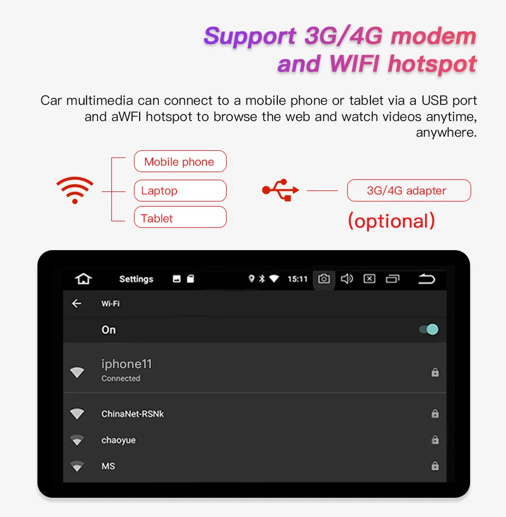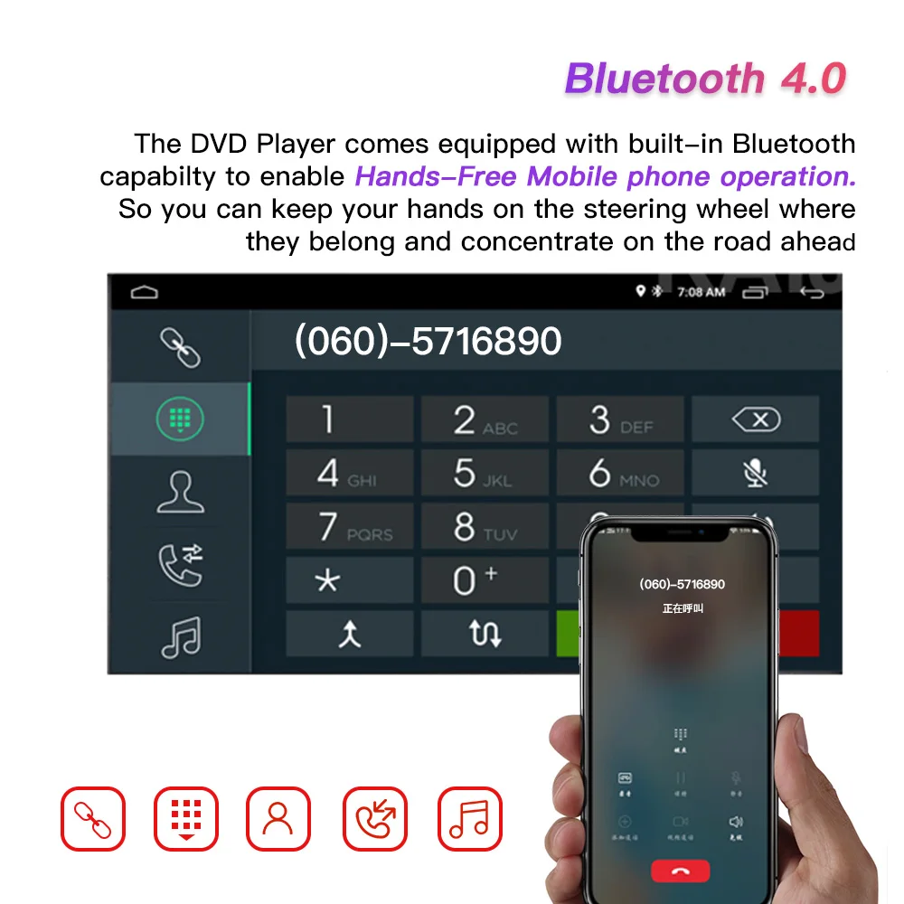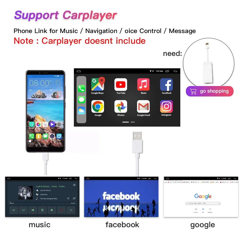 Телефонная ссылка для музыки/навигации/сообщения/Facebook... Примечание: Carplay требует дополнительной покупки