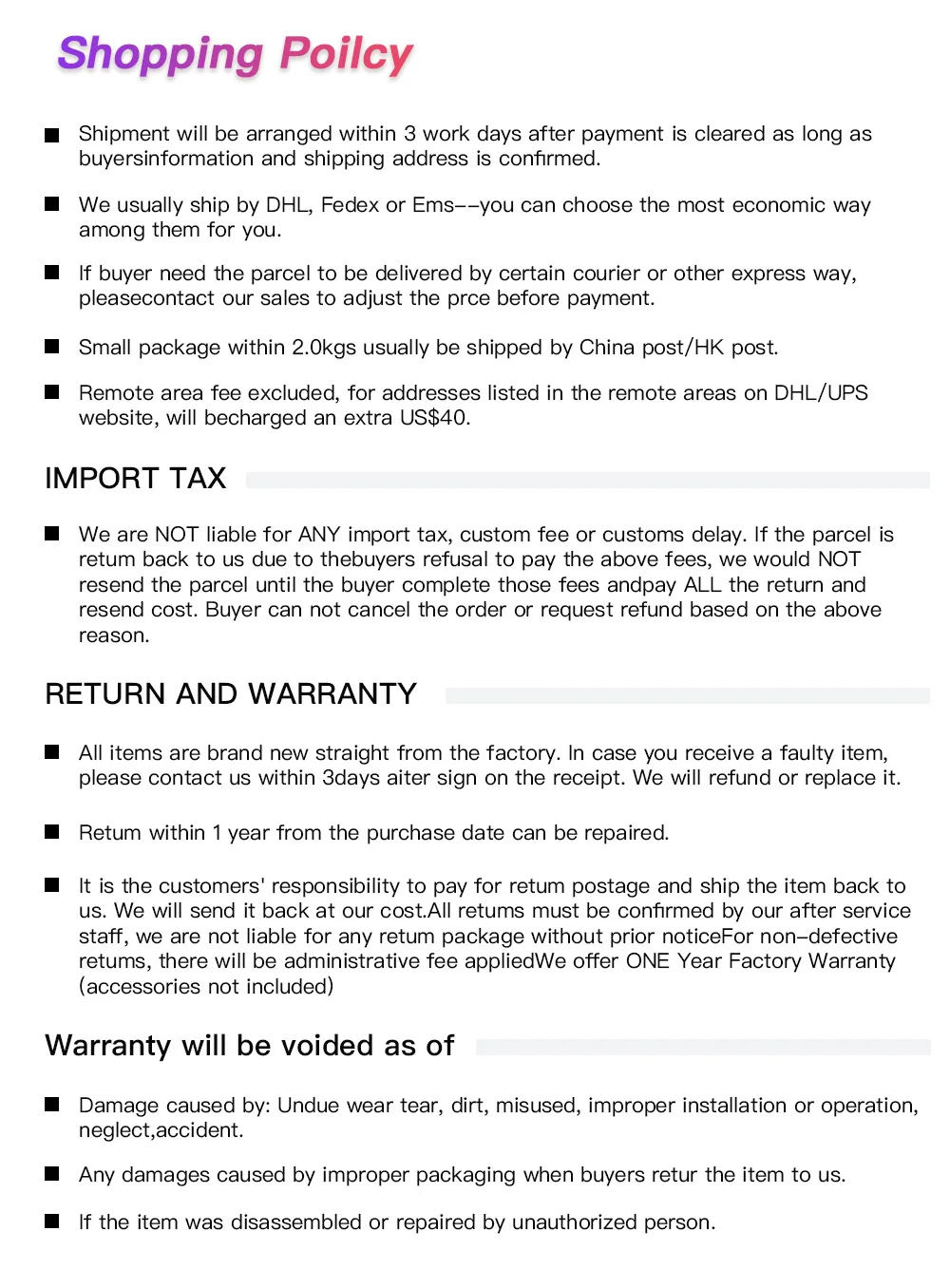 1. Обычно Время доставки: в течение 1 рабочего дня после оплаты Срок поставки: DHL 3 ~ 7 дней, Fedex 5 ~ 10 дней Примечание: налог не включает. 2: Нет налогового канала Если не больше налогов: выберите «способ доставки продавца Тогда товары будут отправлены из Wearhouse Europ DHL или UPS (около 2 недель)