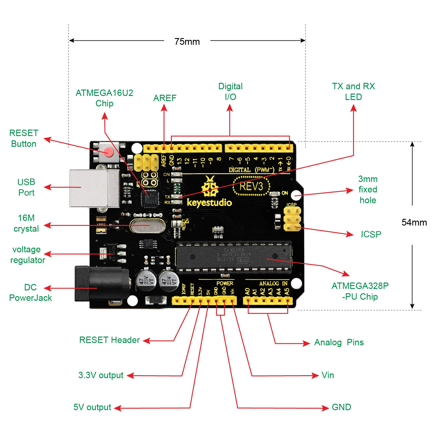 Keyestudio REV3-это плата микроконтроллера, основанная на ATmega328. Он имеет 14 цифровых входных/выходных контактов (из которых 6 могут быть использованы в качестве PWM выходов), 6 аналоговых входов, 16 керамический резонатор MHz, usb-соединение, разъем питания, заголовок ICSP, И кнопка сброса. Он содержит все необходимое для поддержки микроконтроллера; Просто подключите его к компьютеру с помощью usb-кабеля или включите его с адаптером AC-to-DC или батареей, чтобы начать работу.