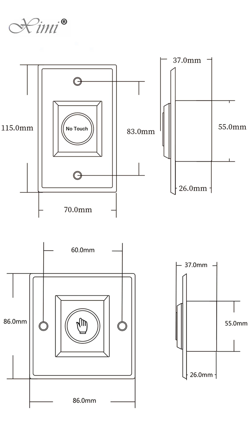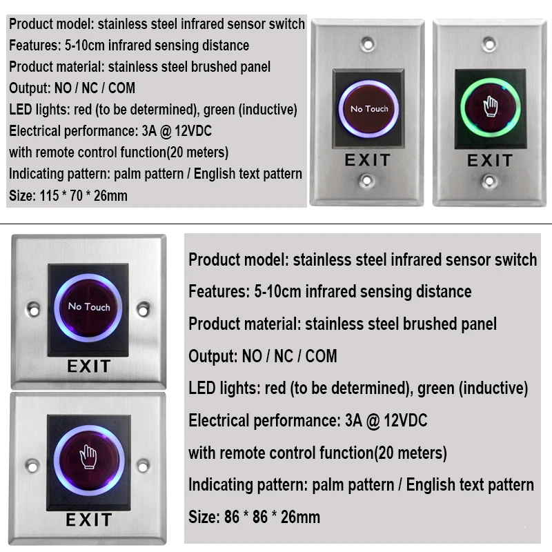8. Рабочая влажность: 0-95% (без конденсации)9. Размеры: 115x70x26 (мм)/86x86x26мм10. Дальность обнаружения: 0,1-10 см11. Белый Светодиодный индикатор: выключение питания12. СинийСветодиодный индикатор: Включение питания (в режиме ожидания)13. Зеленый светодиодный индикатор: Включение питания (Индуктивный)14. Мощность: 12 В постоянного тока (настраиваемый 24 В)15. Контактная Оценка: 12-24 В, 3 А