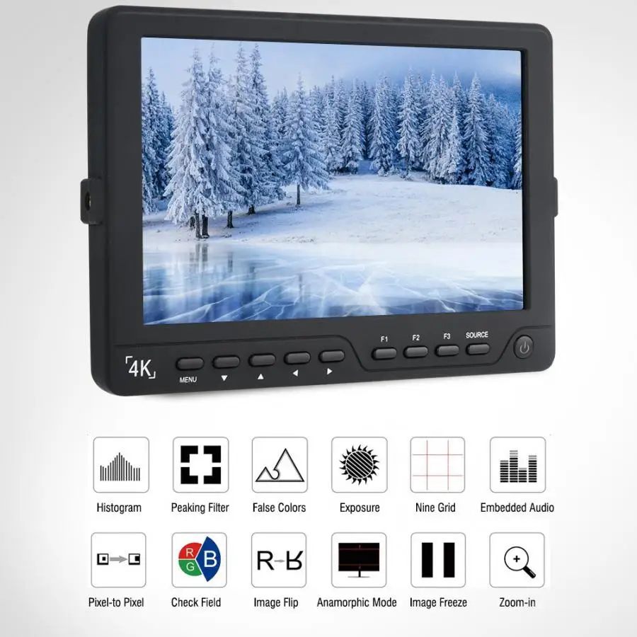 7-дюймовый Большой IPS экран, разрешение до 1920*1200, высокая контрастность и точная цветопередача могут помочь сделать изображения более подробными и насыщенными цветами. Поддержка вывода HDMI высокой четкости 4K, поддержка нескольких форматов s с высокой четкостью, позволяет видеть каждую деталь изображений. Вспомогательные функции камеры обеспечивают множество вспомогательных функций для фотографирования и создания фильмов, таких как пики, Ложные цвета, гистограмма, воздействие зебры, подсканирование, замораживание изображений, центральный маркер, переворачивание изображений и т. д. 1100:1 высокая контрастность, 450cd/m2 высокая яркость и 178 ° Широкий угол обзора для отличного просмотра. Прочный пластиковый корпус, очень компактный и прочный, идеально подходит для активного отдыха. Легкий и портативный, легко носить с собой и хранить. Используйте инструмент для фотосъемки.