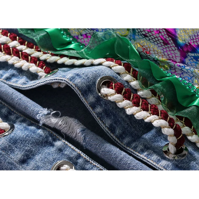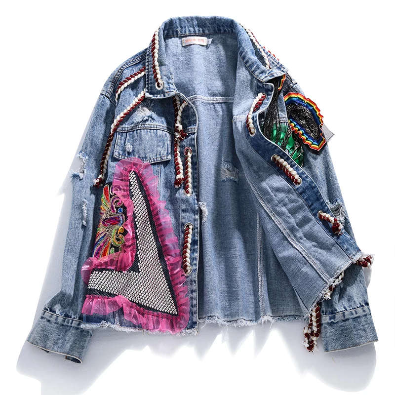 Женская джинсовая куртка в стиле хип-хоп с вышивкой виде бриллиантов весна-осень - купить