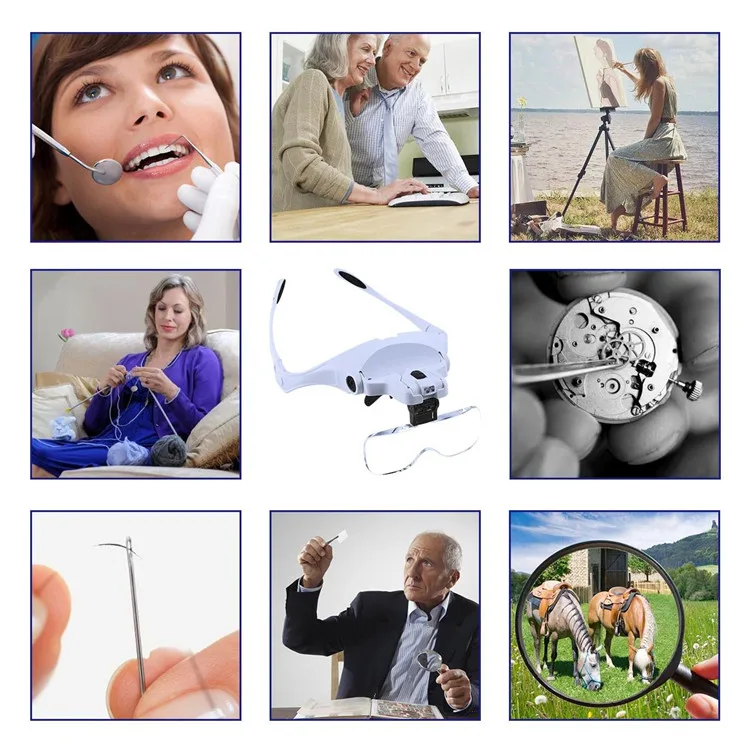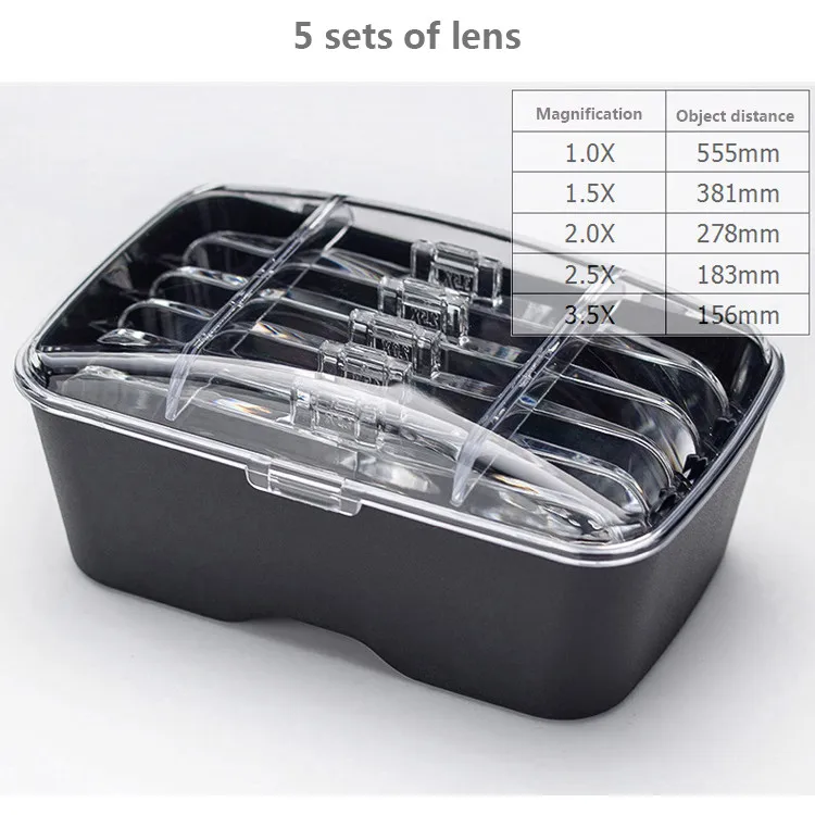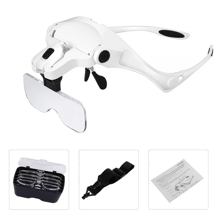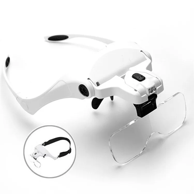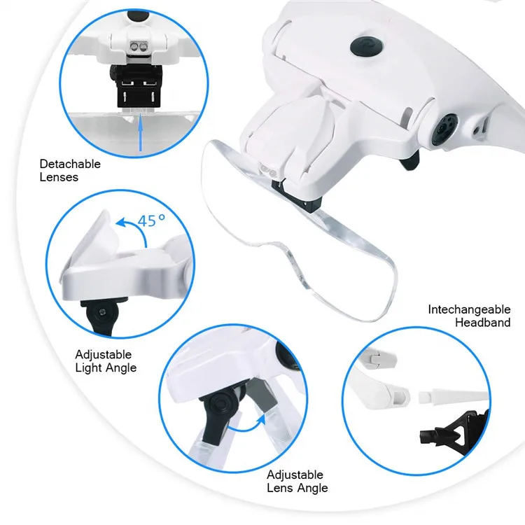 ОписаниеПортативный голову носить увеличительное Стекло Объектив глаз Стекло Сменные Кронштейн повязка Лупа с 2 светодиодный свет 5 пар линз