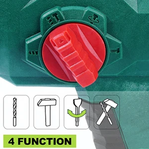 Нажатием одной кнопки переключатель, 4-функция Вы можете легко переключать режимы для ударного сверления, сверления без удара, долбления и уникальную возможность бесступенчатого контроля угла долота. С функцией переключателя на корпусе машины в соответствии с вашими требованиями к работе для стали, бетона, металла, дерева, каменной кладки и т. Д. |