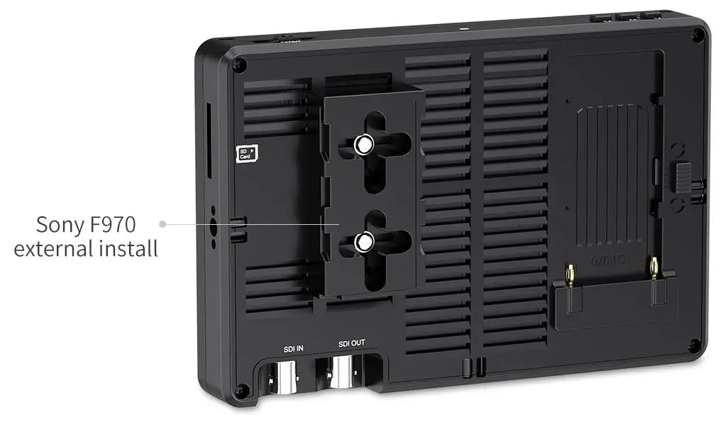 Внешняя установка Sony F970 и дизайн комплекта питания добавляются к задней части монитора. Внешний комплект может использоваться для установки внешнего оборудования, такого как беспроводной передатчик, светодиодный светильник, видеоконвертер и другие устройства, которые могут питаться от аккумулятора Sony F970. Эта инновационная конструкция внешнего источника питания уменьшает необходимость подключения фотографов к внешней беспроводной передаче, светодиодный светильник и другое оборудование, значительно экономя пространство, занимаемое оборудованием, и уменьшая вес фотографического оборудования. Комплект имеет два поперечных слота, вы можете отрегулировать положение внешнего устройства, ослабляя винты. Если вам не нужен комплект, вы можете непосредственно ослабить винты, чтобы удалить комплект.