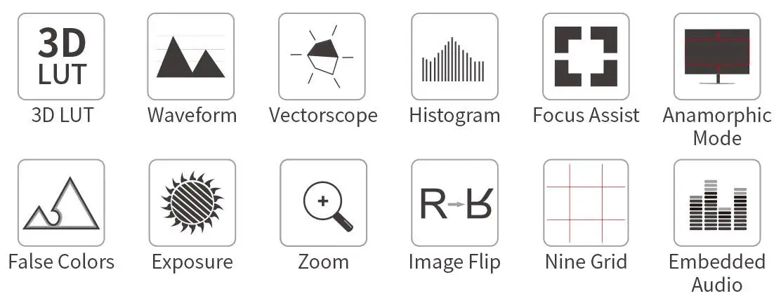 Наша гибкая ОС упакована с обширным набором областей, все 1-touch и просты в использовании. Видео ОС включает в себя инструменты для фокусировки, кадрирования и экспозиции (сигнал, RGB парад, векторная область, RGB гистограмма, гистограмма, измеритель звуковых сигналов, фокусировка пика, зум, Зебра, ложный цвет, направляющие рамки, безопасная зона и т. Д.) вместе с гибкой 3D LUT реализацией (Используйте встроенный журнал для записи 709 видео или загрузки. Кубические файлы) и опции для мониторинга анаморфного деформации.