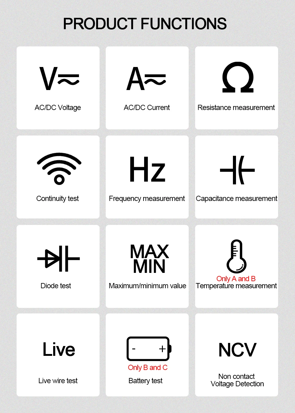 1. Максимальный дисплей: дисплей Maxium 60002. Интеллектуальная идентификация и ручная функция интегрированы3. Частота выборки: около 3 раз в секунду4. Отображение диапазона: наивысшее положение показывает «OL»5. Дисплей низкого напряжения: индикация низкого заряда батареи6. Рабочая среда: (0-40)°C, относительная влажность <80%7. Питание: 2x1,5 V батарейки типа AAA (не входят в комплект поставки)8. Это стабильная производительность, высокая точность, высокая надежность четких показаний и защита от перегрузки.