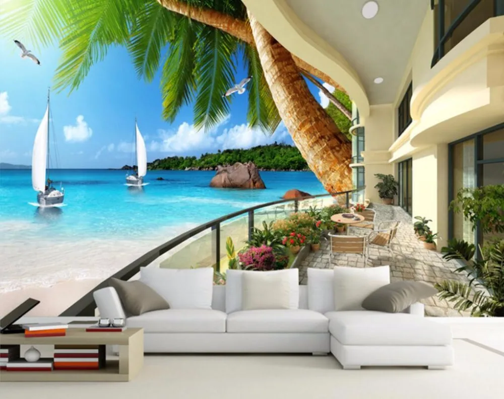 Купить Пользовательские обои CJSIR гавайский курорт балкон морской пейзаж кокосовое