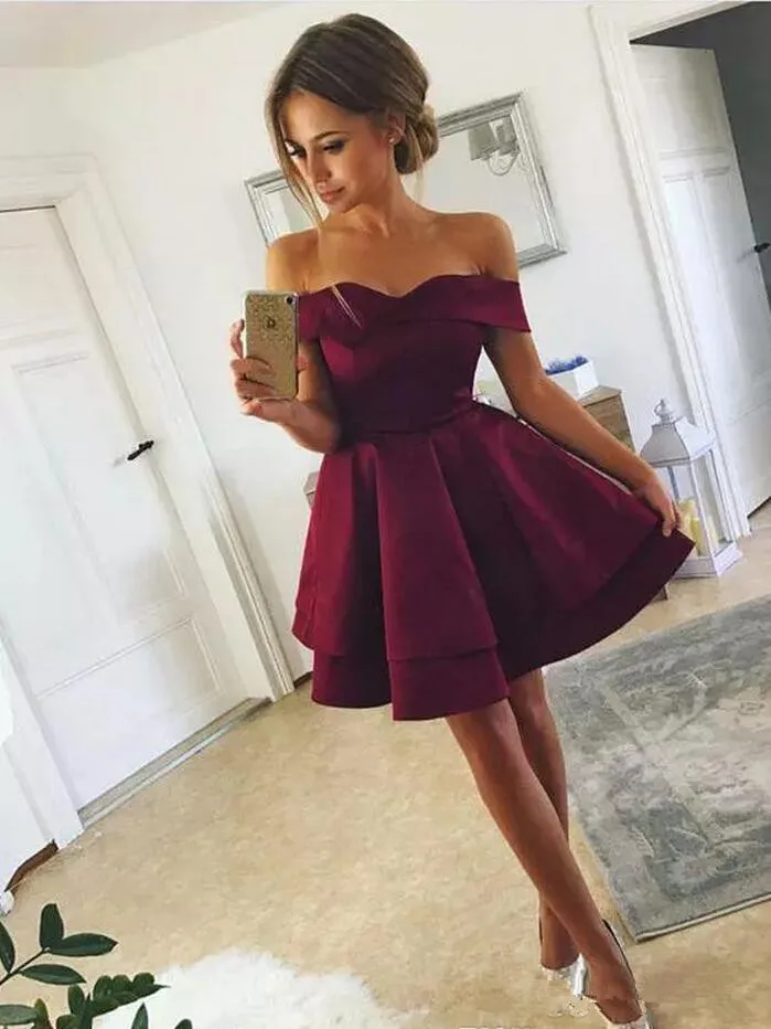 Милое платье с открытыми плечами для встречи выпускников ярусный сатин - купить