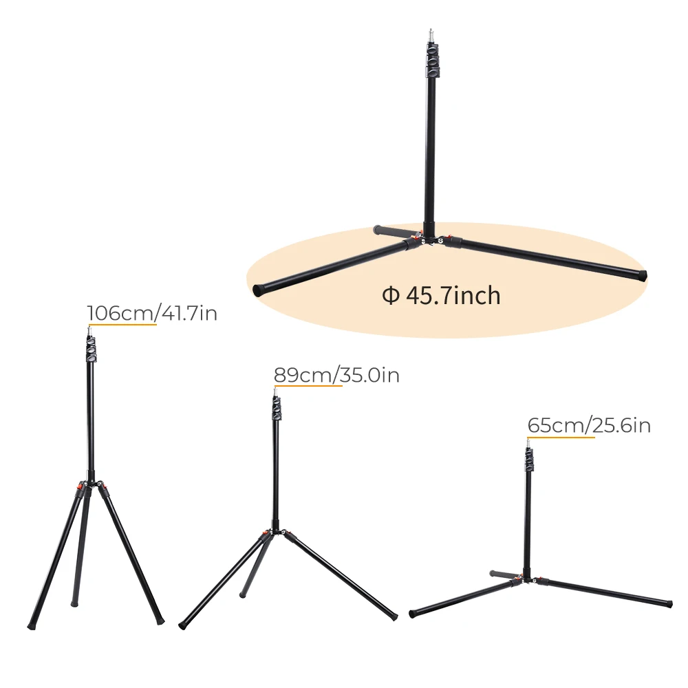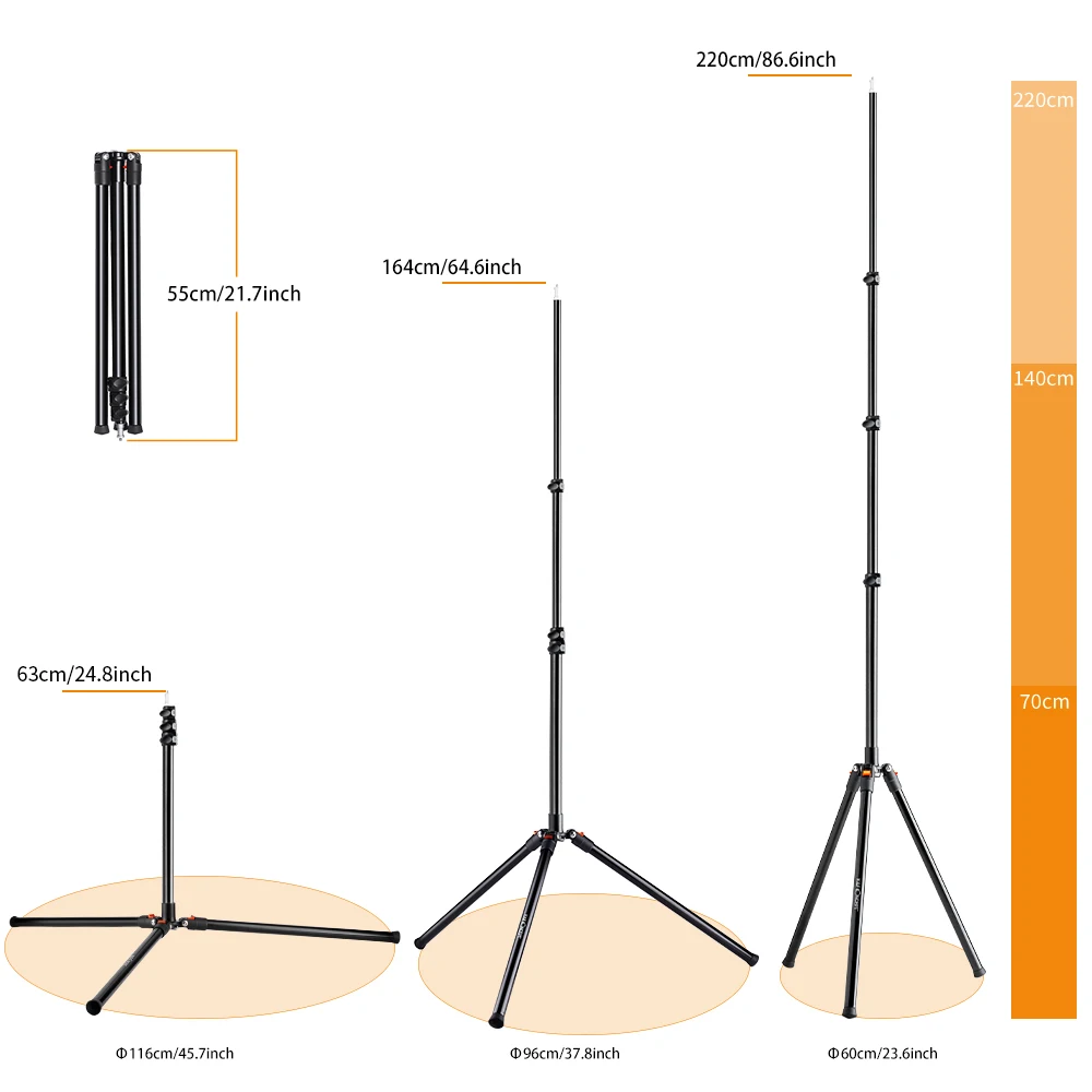 Регулируемый расширенный дизайн высотой не менее 55 "/1,4 м, а максимальная высота 86,6"/2,2 м, отвечающий вашим различным требованиям студия/фотография. Наиболее Рекомендуемая высота стойки для светильник составляет 81 "/2,06 М.