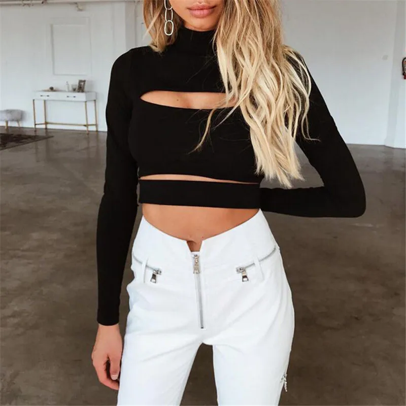 Купить Женский укороченный свитер с длинным рукавом черный ажурный пуловер для клубов и