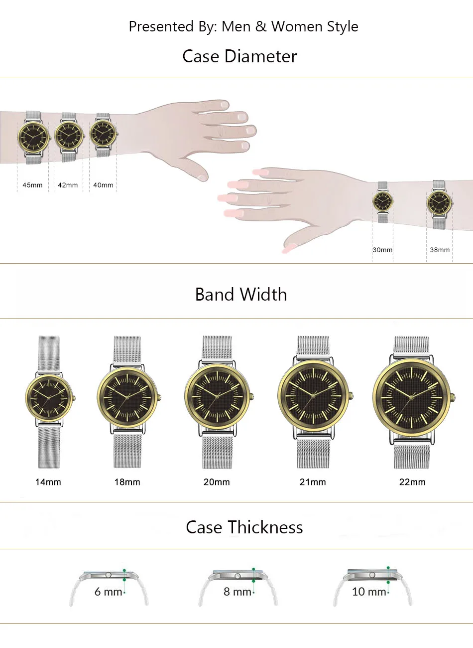 Циферблат часов Ширина: Для мужчин Тип: 3,0 см, Для женщин Для мужчин Тип: 2,5 см Циферблат часов Толщина: 0,9 см Ремешок для наручных часов Ширина: Для мужчин Тип: 2,0 см, Для женщин Для мужчин Тип: 1,7 см Длина ремешка часов: для мужчин, Тип: 21 см, для женщин и мужчин, Тип: 18 см