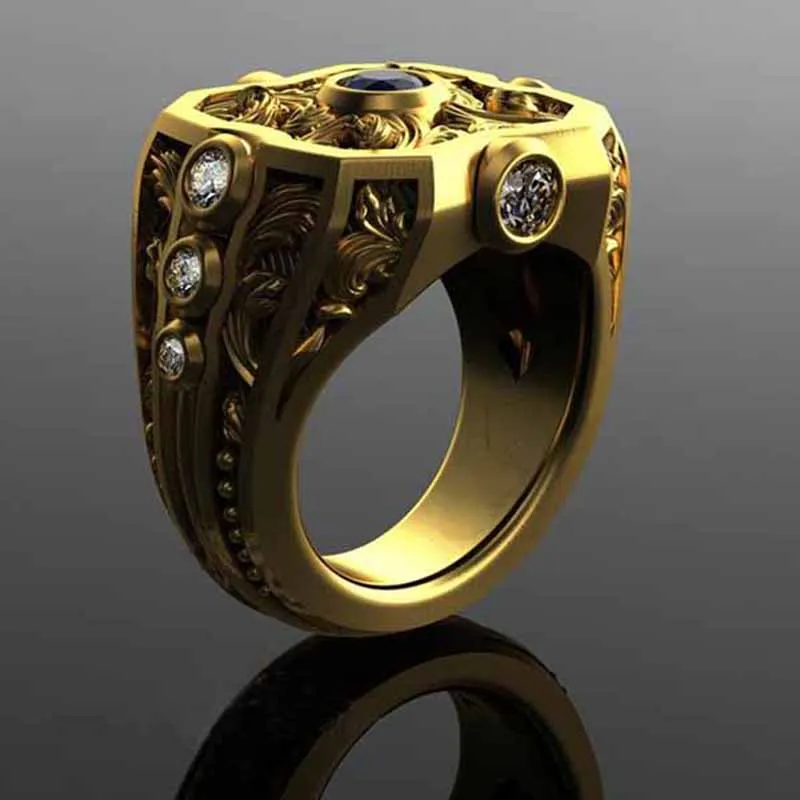 Vintage luxury Russian Men Large Ring Exquisite Pattern Carving Gold Blue CZ Ring Birthday Anniversary Gift Banquet Jewelry
