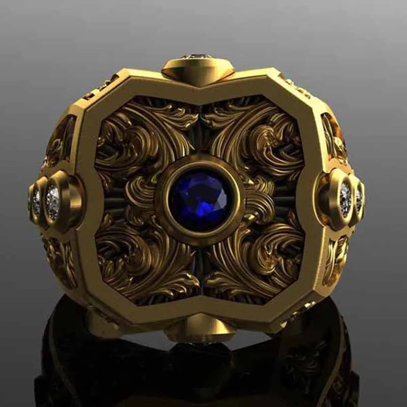 Купить Vintage luxury Russian Men Large Ring Exquisite Pattern Carving Gold Blue CZ Birthday Anniversary Gift Banquet Jewelry | Украшения и