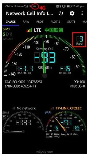 (B) если нет iphone или Samsung, скачать приложение: cell maper или LTE discovery, вы можете увидеть, что за полоса есть сигнал и частота.