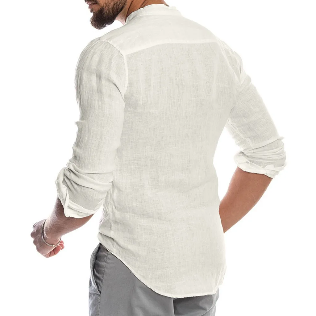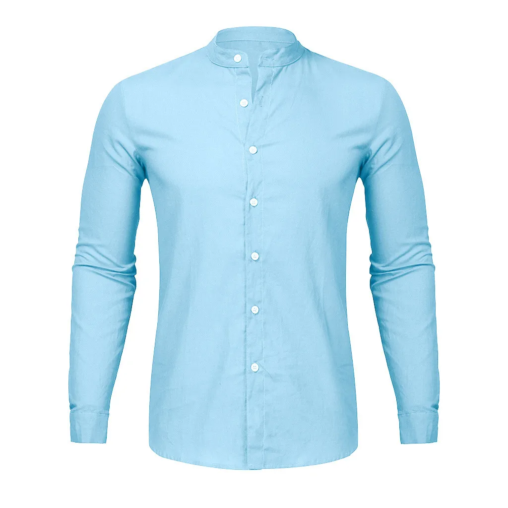 Мужская белая однотонная пляжная рубашка без воротника с пуговицами и длинным - купить