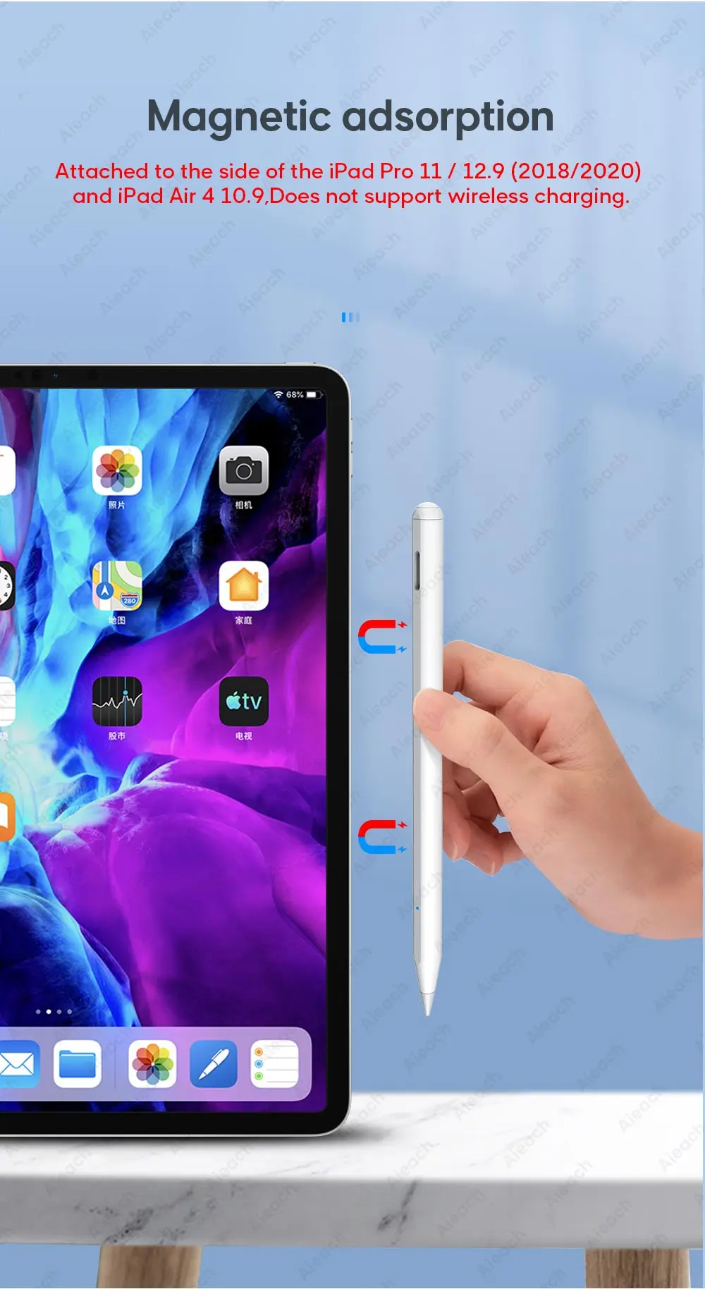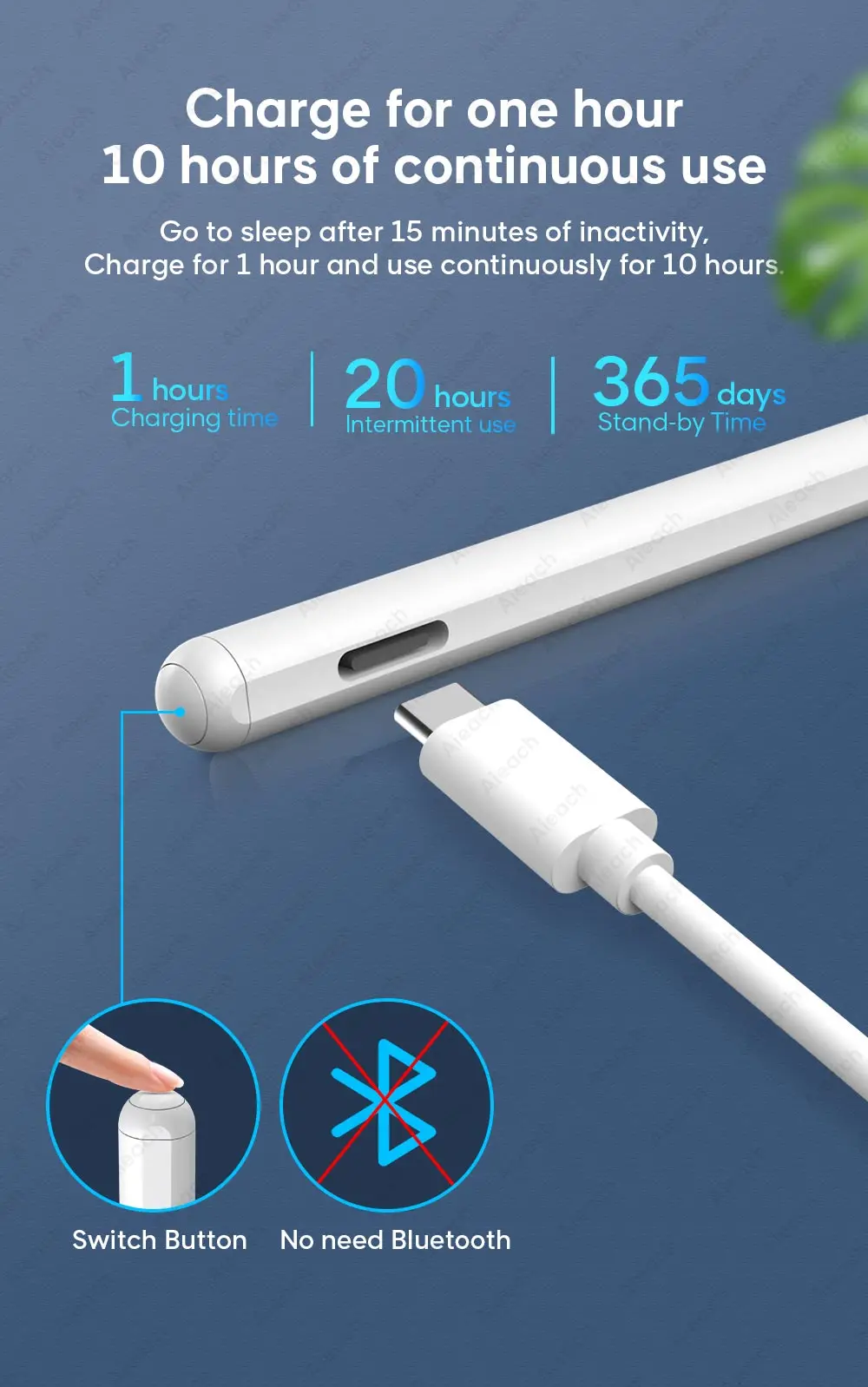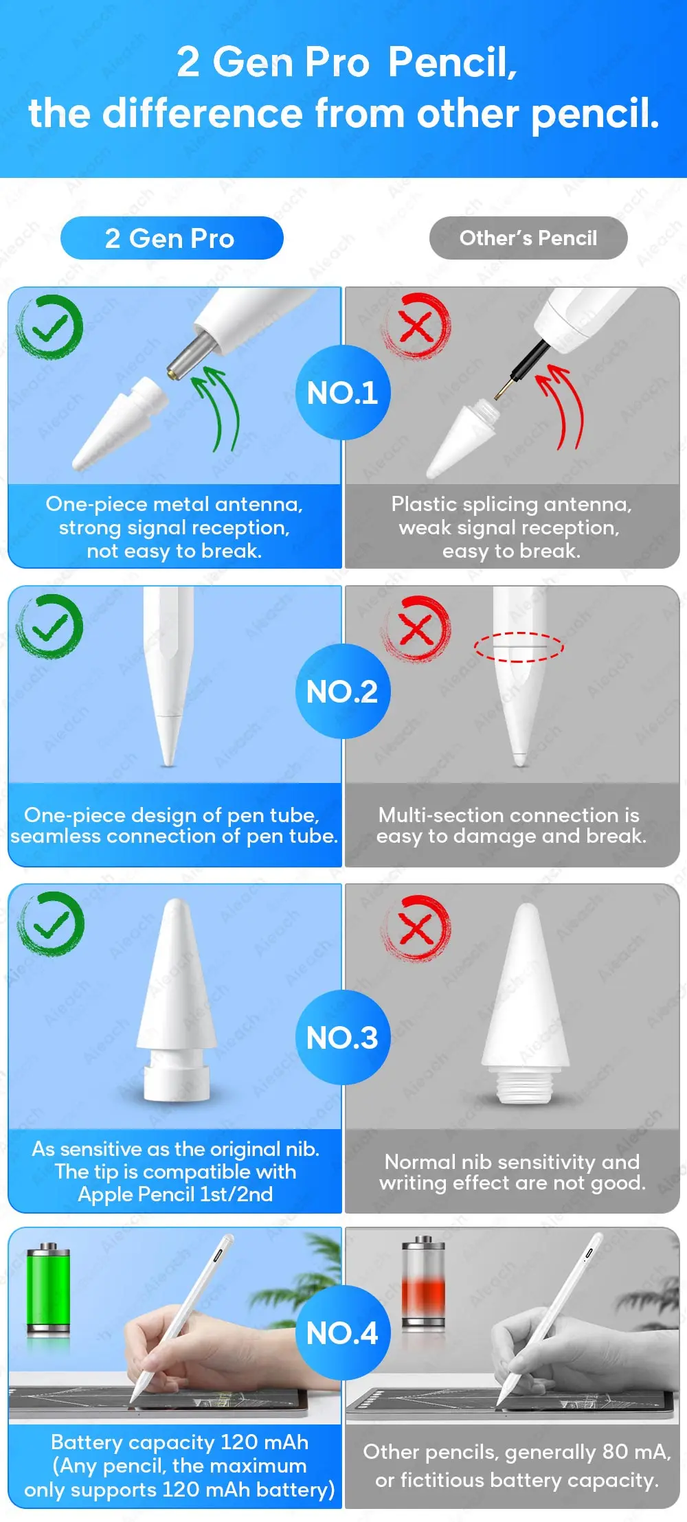 ① Цельнокроеная металлическая антенна, сильный прием сигнала, не легко сбивать. ② Цельный дизайн трубки пера, бесшовное соединение трубки пера. ③ Так же чувствителен, как и оригинальный наконечник. Наконечник совместим с Apple pencil 1/2. ④ Большая емкость аккумулятора 120 мАч.