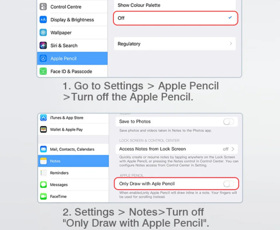 О: пожалуйста, не волнуйтесь! Пожалуйста, проверьте, что он был заряжен и включен, Затем перейдите на свой ipad и выключите «только нарисуйте карандашом apple», как показано на следующем рисунке