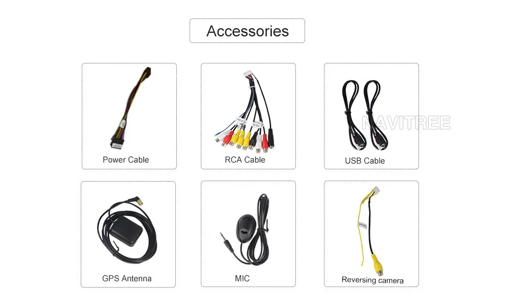 Один кабель RCA с внешним входом микрофона, один кабель камеры заднего вида с Wi-Fi и сигнальными кабелями BT, один антенный кабель GPS, два usb-кабеля, один установочный инструмент, один внешний микрофон