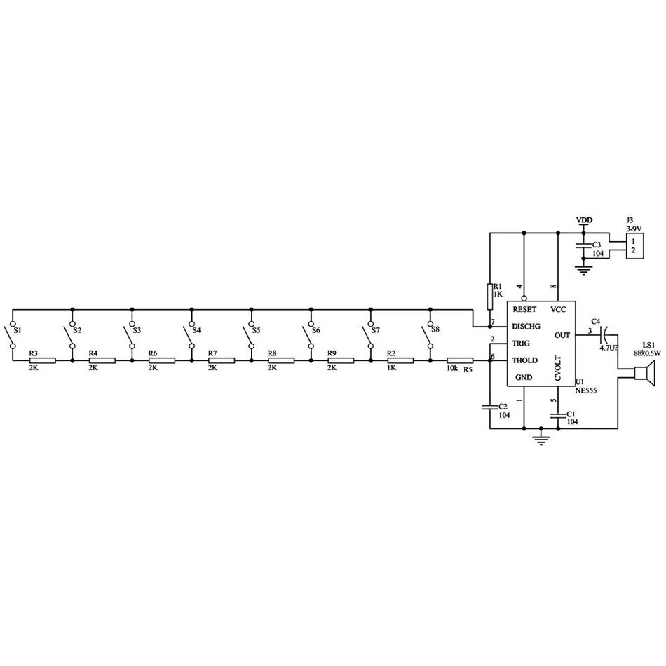 Масштаб цепи может производить различные звуки, в то время как разные клавиши соответствуют различным шкалам. Игра электронного органа заключается в использовании пальцев для нажатия разных клавиш для производства различных весов. Принцип заключается в том, что цепь IC555 соединена с осциллятором, частота колебаний которого определяется сопротивлением цепи (R1- R10), поэтому различные звуки будут генерироваться из-за различных клавиш.