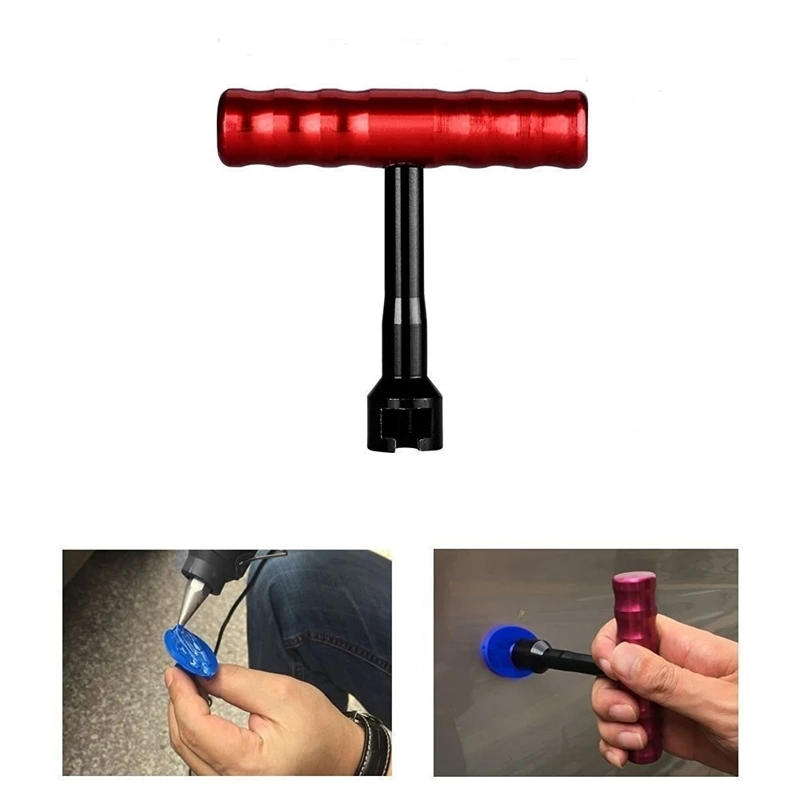 Steps:clean the dent and keep it dry!take out the glue stick,insert it in glue gun and waiting 5 minutes,take out the blue/red tab,and smear the glue on the tabs,quickly stick it to the dent of the car,and wait for 10 minutes.fasten the gold puller with the blue tabs,adjust the height of the gold puller use different strength to pull the blue tabs.Pay attention to the intensity of the control.cleaning! Spray alcohol on the surface and remove the residue with a the rubber shovel