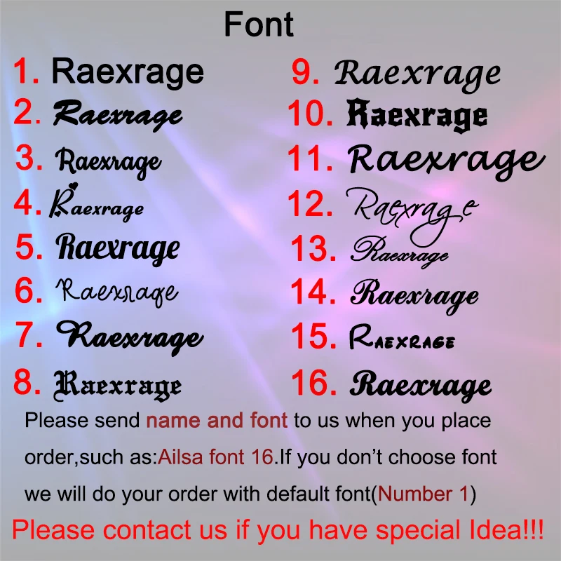 Method1: find the link you want,click the "Contact"(at the left of the link).you can contact us there Method2:when you please order,you can find "leave message", then can send name and font there Method 3:after you make order, you can click chat about this order, then can find us method 4:you can Favorite my shop,At the top of store home, you can click "Raexrage customized Store", then can find "Contact now"