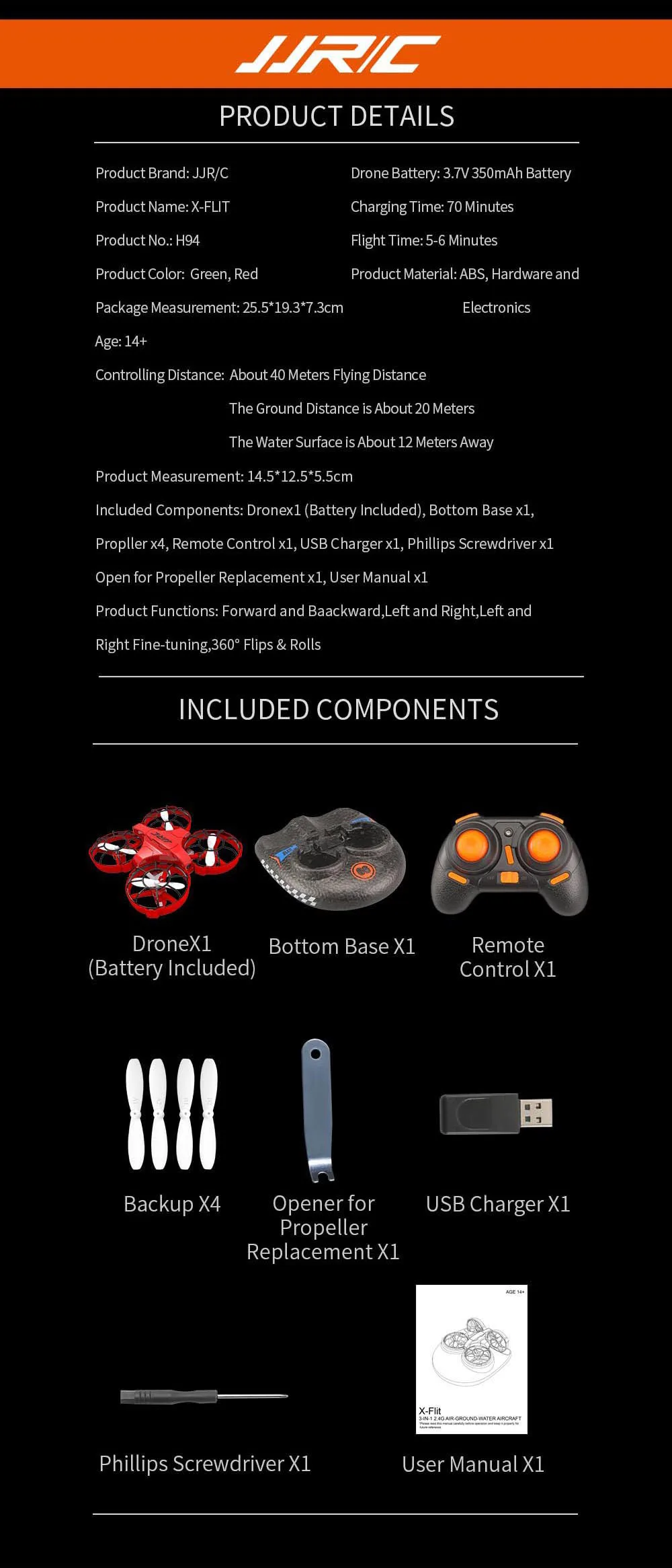Функция:Вверх/вниз, вперед/назад, поворот влево/вправо, поворот влево/вправо, полет в сторону, режим полета (летательный аппарат самостоятельно), режим вождения, серфинг, над водой режим, 3 уровня скорости полета, безголовый режим, автоматический возврат одной кнопкой, поворот на 360 °, Автоматическая сигнализация