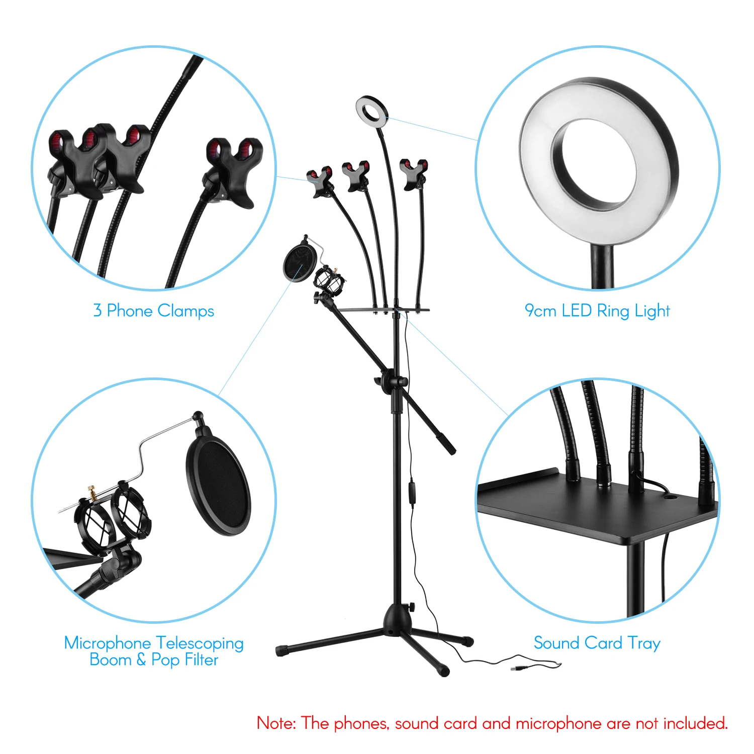 Телескопическая стрела и фильтр: штатив оснащен телескопической стрелой и микрофонным фильтром, предназначенным для крепления вокального микрофона, идеально подходит для потоковой записи в реальном времени.