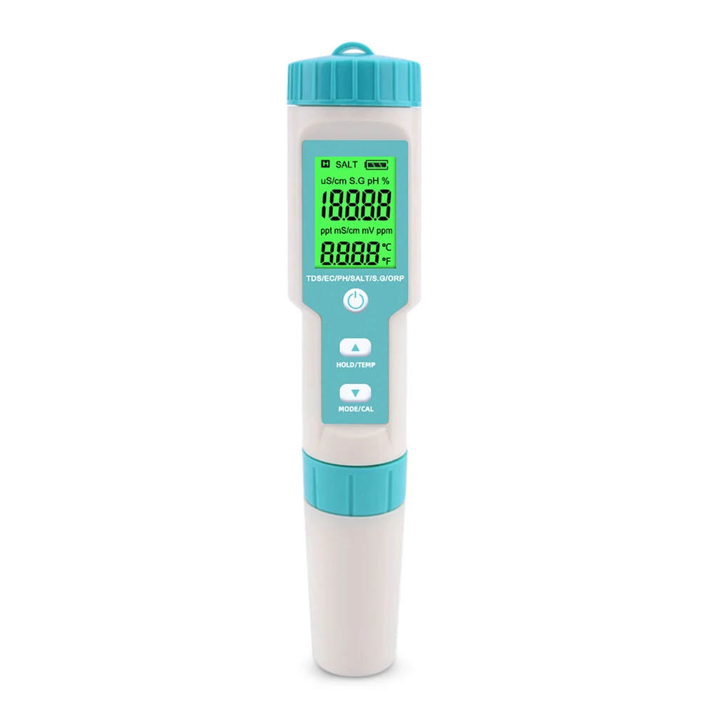 Он может измерять PH / TDS / EC / ORP / S.G/удельный вес морской воды/температуру. Диапазон измерений большой и широкий и может измерять соленость пресной воды и морскую соль.