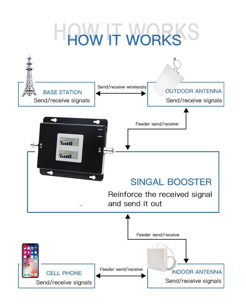 1. Принимает сигнал Мощная антенна достигает выхода, чтобы получить доступ к хорошему сигналу, и доставляет его к бустеру. 2. Повышает сигнал Усилитель принимает сигнал, усиливает его и служит релейным сигналом между вашим телефоном и близкой башней сотовой связи. 3. Сигнал передачи Ваши устройства получили повышенный прием сотовой связи, а звонки и данные подаются через усилитель обратно в сеть. Примечание: Пожалуйста, убедитесь, что место, где вы хотите установить,-это WCDMA 3G. И убедитесь, что вы можете получить не менее 2 бар 3G сигнала на открытом воздухе, прежде чем купить, в противном случае этот продукт не может вам помочь. Для уличного использования необходим хороший сигнал, чтобы улучшить сигнал в помещении.