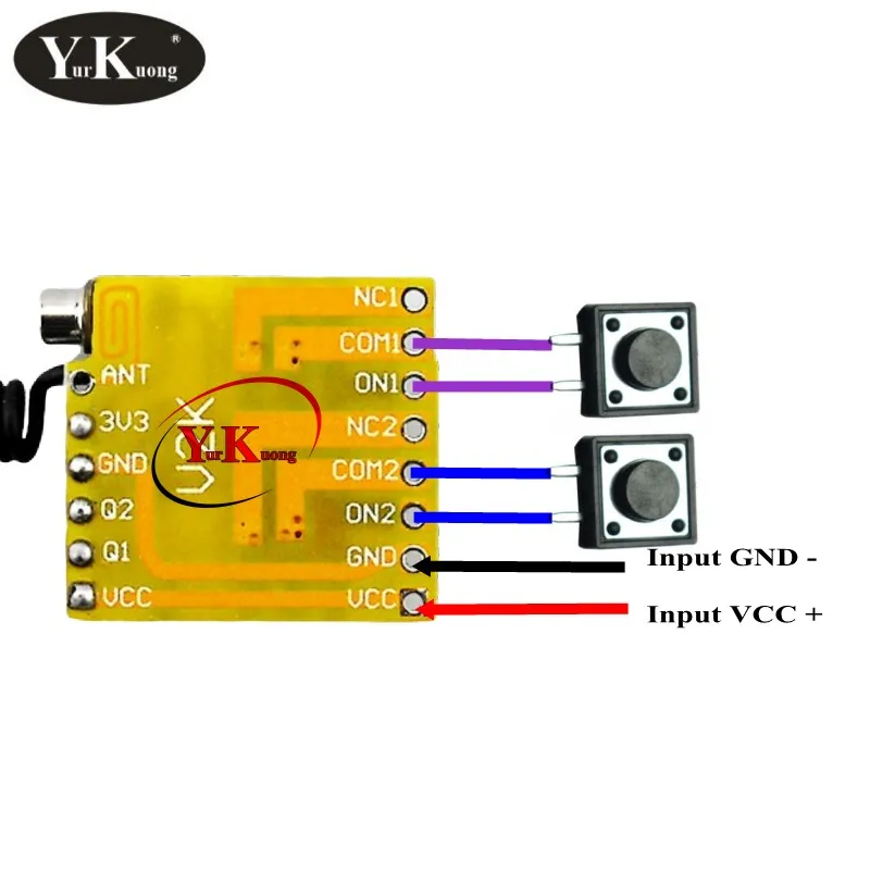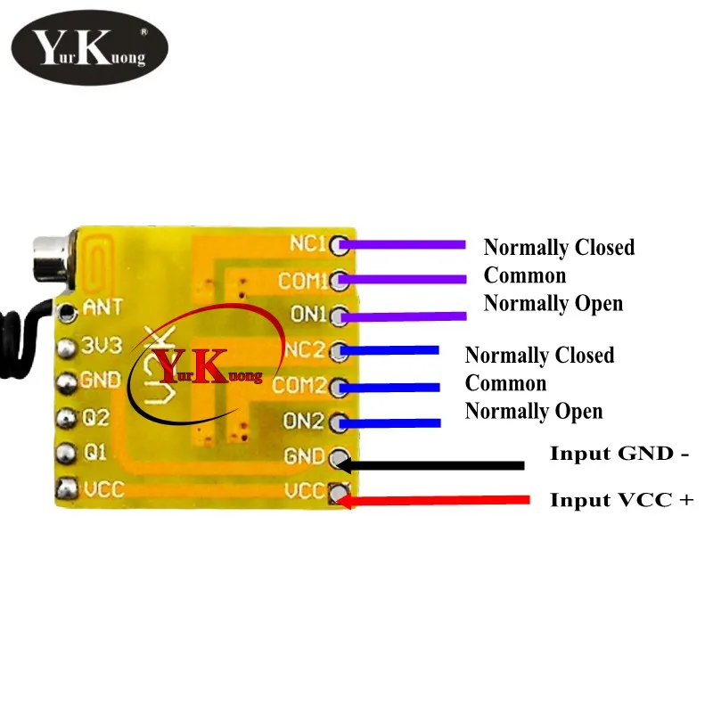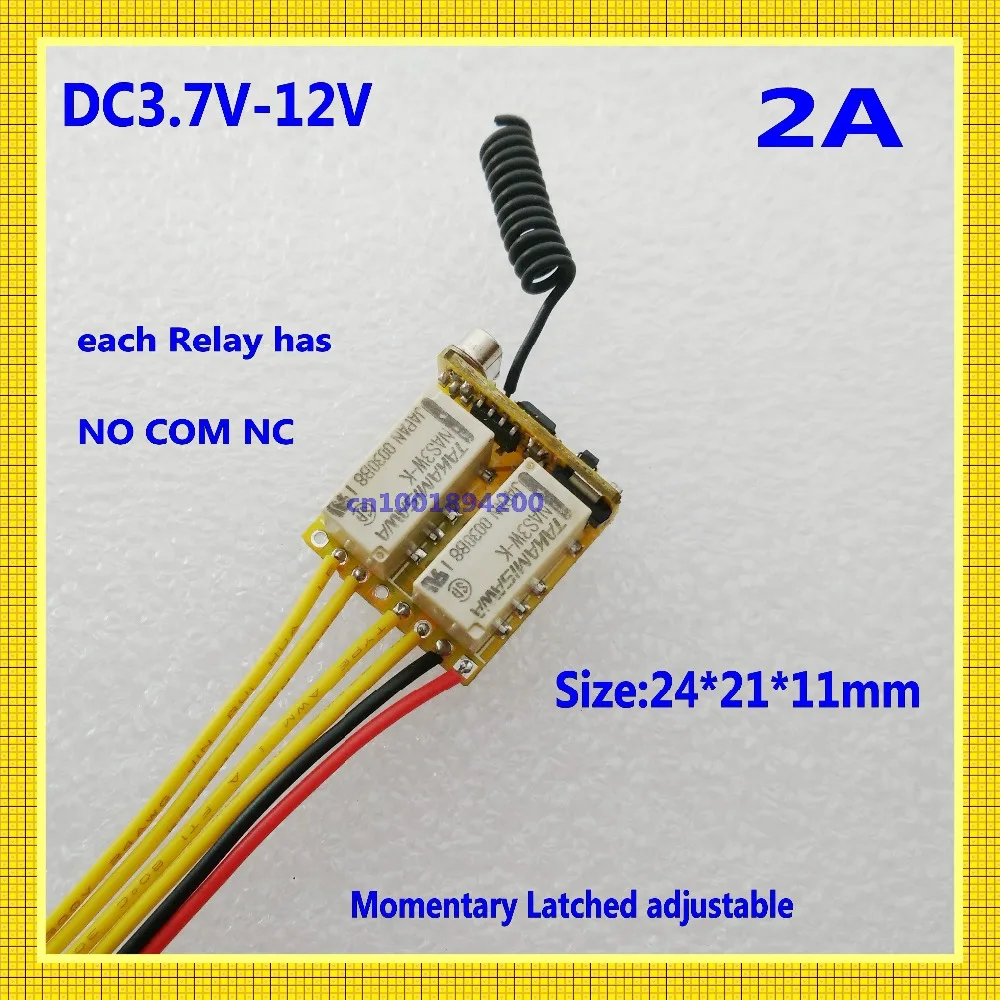 Рабочее напряжение: DC3.7V-DC12V (Широкий диапазон рабочего напряжения DC3.7V 4,5 V 5V 6V 9V 12V все в порядке) (Может работать с питанием постоянного тока, перезаряжаемой литиевой батареей, перезаряжаемым Pal) Максимальная нагрузка: реле 2A (имеет лучшую нагрузку менее 700 мА каждого реле) Ток в режиме ожидания: 7 мА Рабочий ток реле: 1 реле на 50 мА, 2 реле на 100 мА Размер: 24*21*11 мм Режим работы: Мгновенная задержка, Отрегулированная при пайке Тип кодировки: обучающая точка, чтобы добавить передатчик Обычно открытый порт (NO1 NO2) Common Port (COM1 COM2), обычно закрытый порт (NC1 NC2) Вход DC3.7V-DC12V Выход с напряжением 0 в значение для переключения использовать реле без COM NC Мгновенное нажатие на кнопку передатчика A и удерживание, реле приемника № 1 включен, Отпустите кнопку A, реле приемника № 1 выключено. Нажмите кнопку передатчика B и удерживайте, реле приемника № 2 включен, Отпустите кнопку B, реле приемника № 2 выключено. Защелкивающийся, нажмите передатчик A, приемник № 1, включен, Нажмите кнопку B, приемник № 2 включен, приемник № 1, релейный выход выключен,