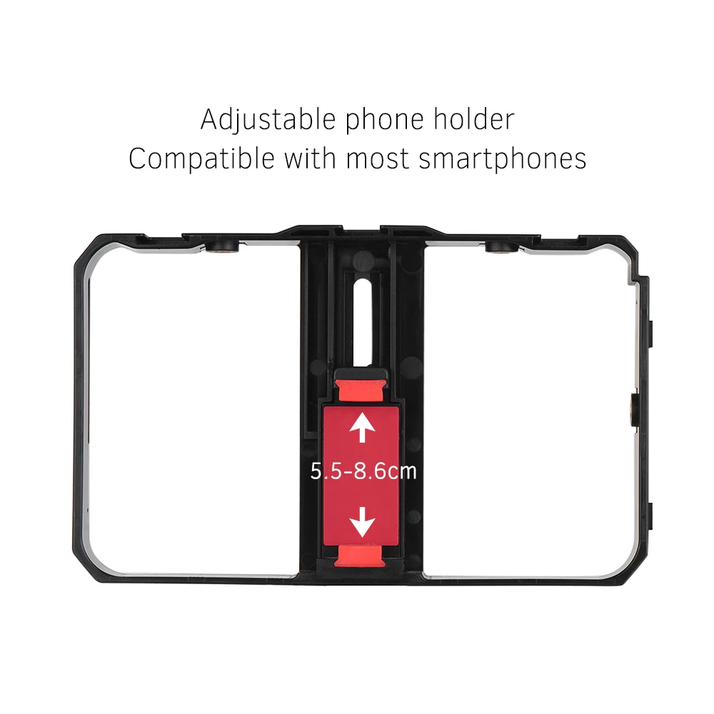 Ручной видеокронштейн для смартфона имеет несколько креплений для холодного башмака и 1/4 дюймовые винтовые отверстия на верхней части для установки микрофонов или мини-светодиодных ламп, очень удобно и практично.