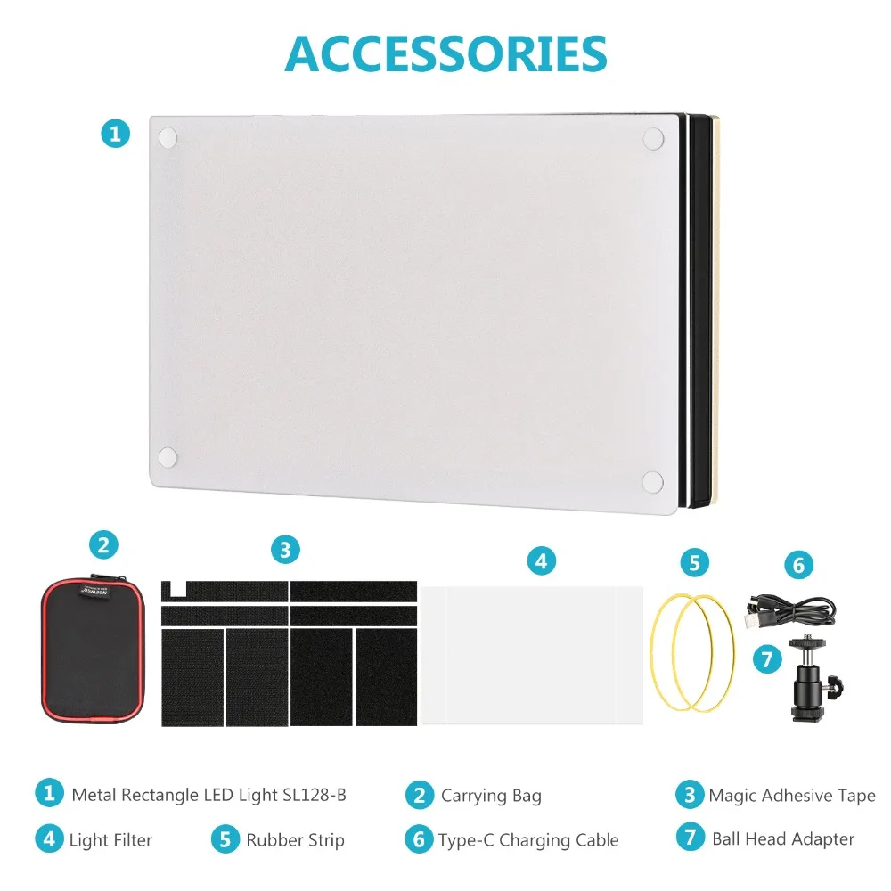 1 x SL128 светодиодный свет 1 х шаровой головкой адаптер 1 х рассеиватель света 1 х световой фильтр 2 х Резиновая полоса 4 лента-липучка «Magic клейкая лента Чехол для переноски (1 шт.); 1 х USB Type-C кабель для зарядки 1 х Инструкция по эксплуатации