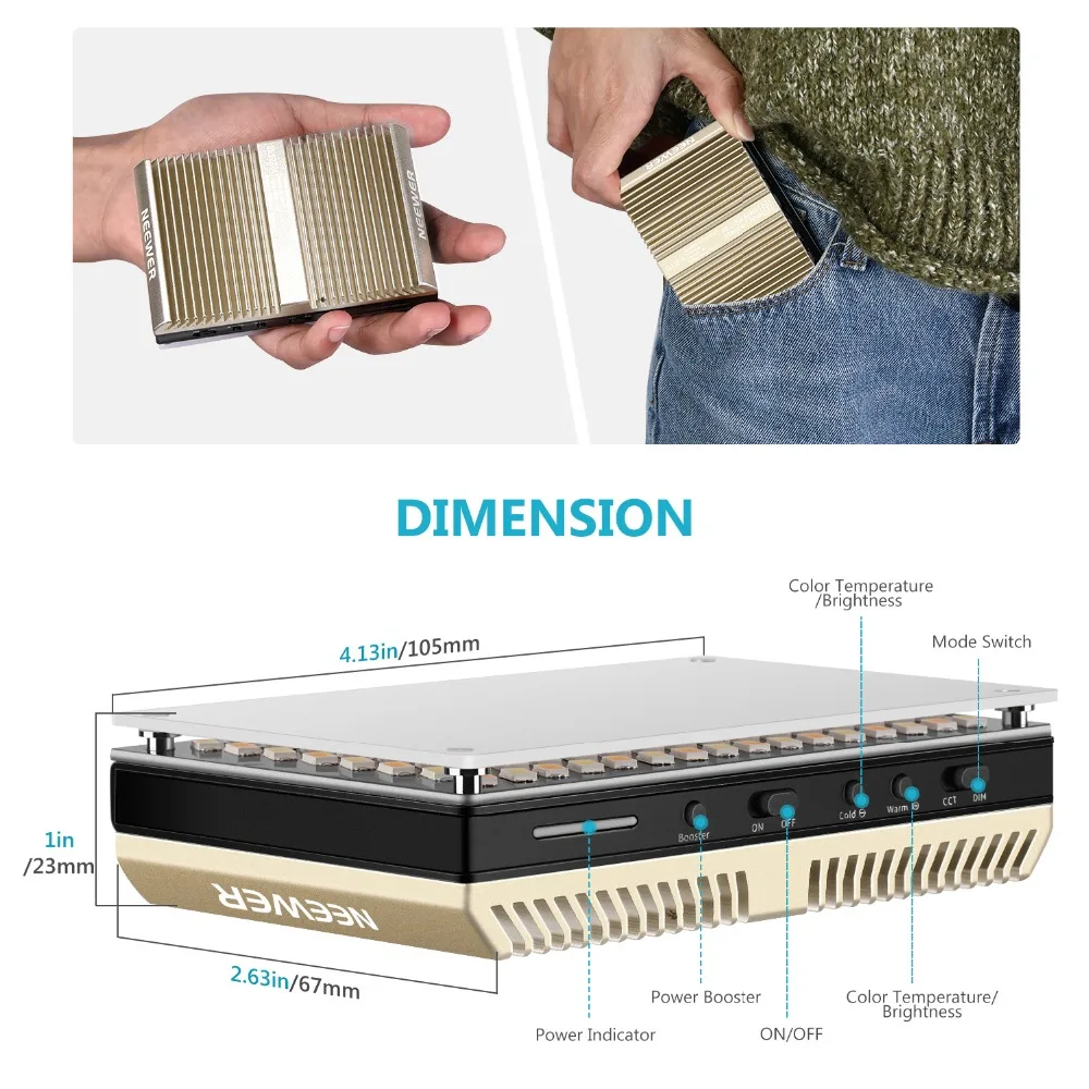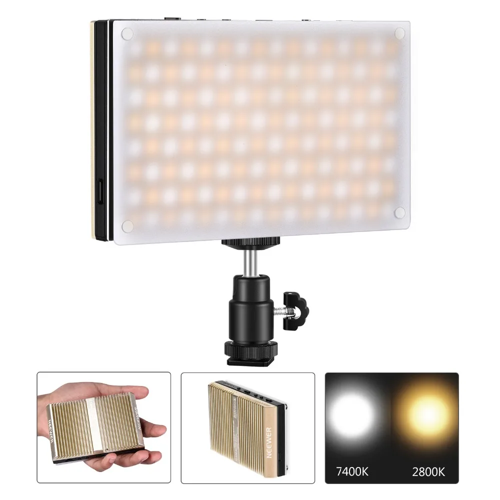 Neewer SL128 карманный фонарик со светодиодной лампой, 128 SMD светодиоды, dimmable bi-цвет 2800-7400K, CRI95 + с компрессором высокого давления режим и встроенный аккумулятор, металлический корпус с зарядным кабелем/фильтр/рассеиватель/клейкая лента