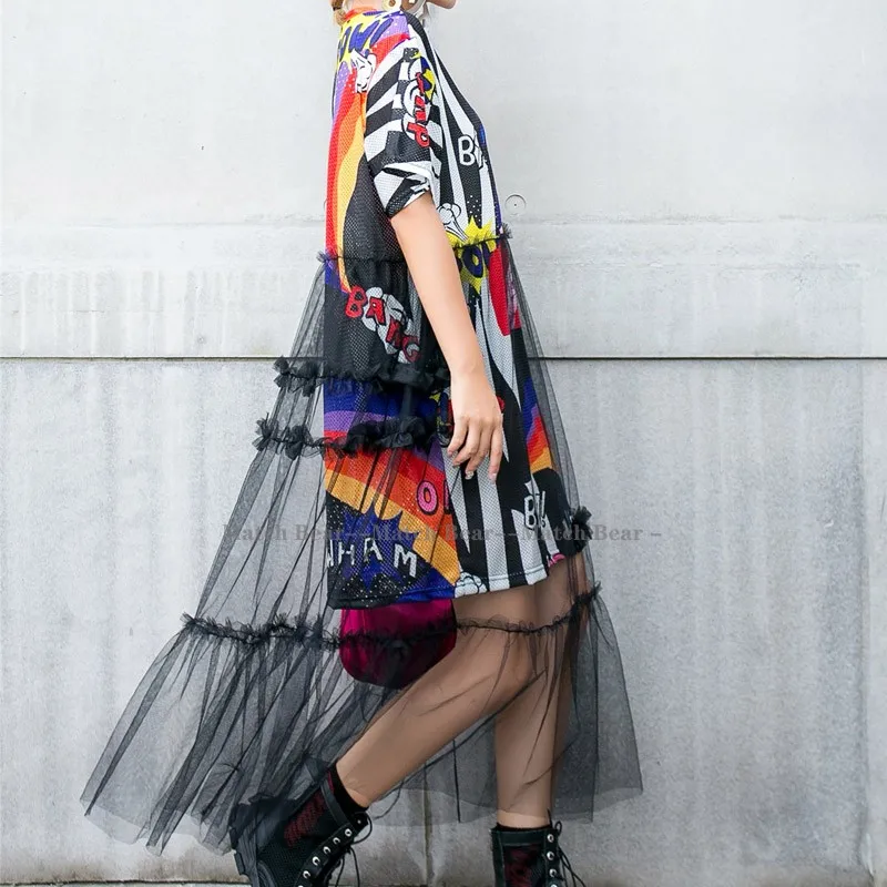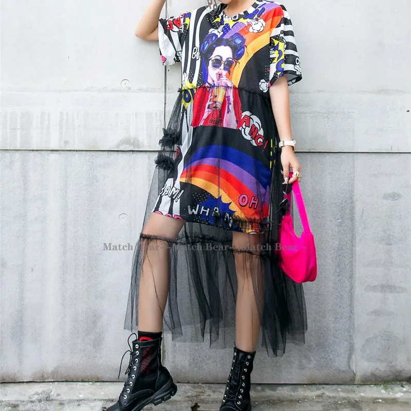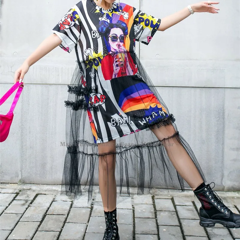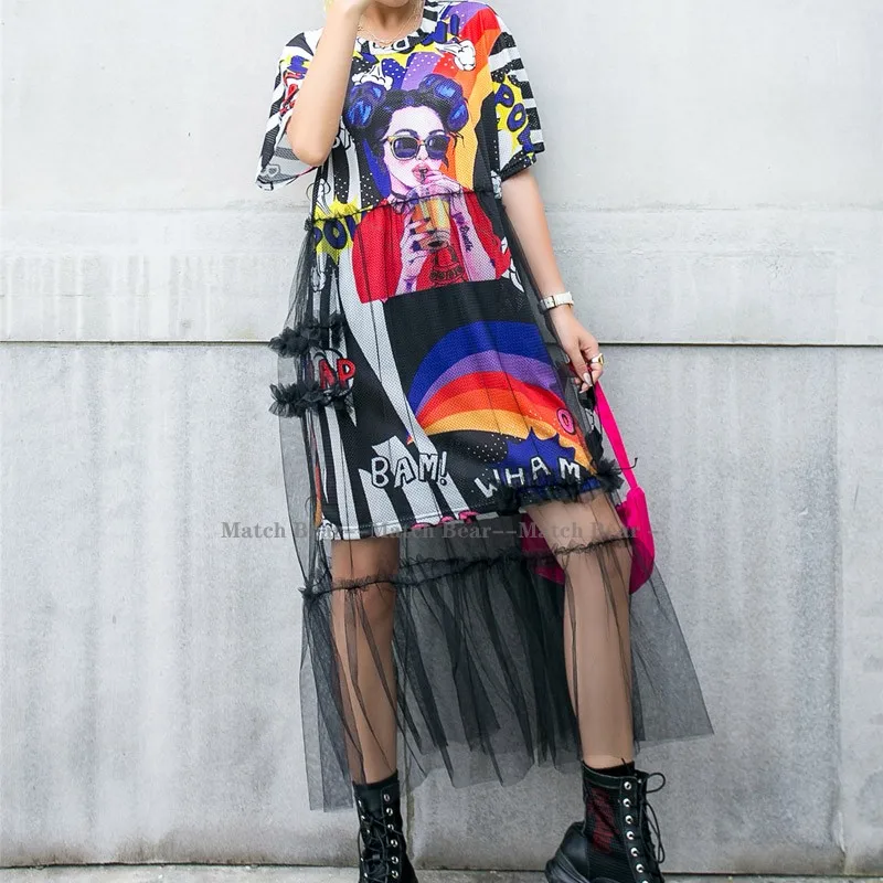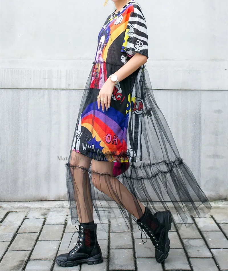 Сетчатое красное Брендовое платье большого размера 2020, летнее платье, модное Сетчатое платье-футболка из двух предметов с рисунком, длинное платье