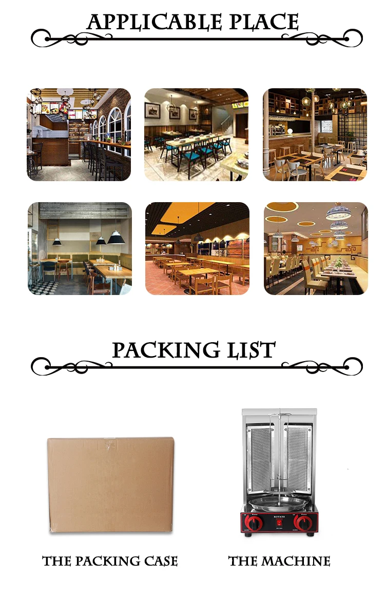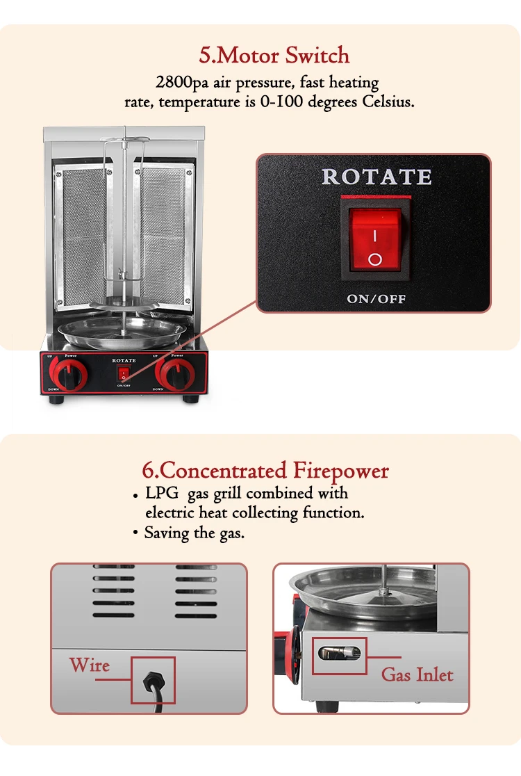 Описание:Тип: машина для газовых бройлеровНапряжение: 110 В/220 ВМощность: 10000BTUКонтроль температуры: 0-300 градусов ЦельсияСкорость вращения: 5 об/минДавление воздуха: 2800PaВоздухозаборник: G1/2Материал: 201 нержавеющая стальФункция: Автоматическое вращениеВес подшипника: около 8 кг мясаОсобенности:1. Машина для приготовления шаурмы имеет концентрированный дизайн огневой мощи.2. Газовый гриль LPG в сочетании с электрическим сбором теплаФункция, 2800 ПА давление воздуха, быстрая скорость нагрева.3. Экономия Газа при изготовлении шаурмы для барбекю.4. Гладкая конструкция из нержавеющей стали с двумя горелкамиРазработано, чтобы обеспечить хрустящую внешнюю поверхность, сохраняя их сочными внутри.5. Улучшенный материал, антикоррозийный, может регулировать фиксацию шпагата.