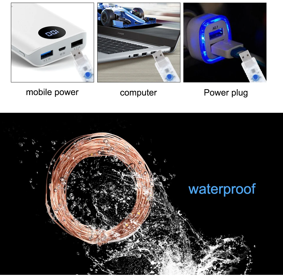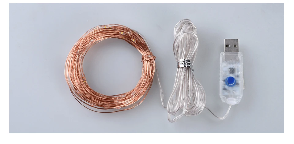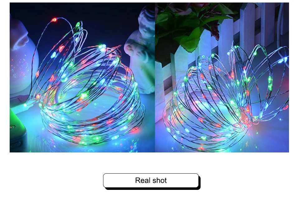 Спецификация: Длина: 5 м 10 м Цвет излучения: теплый белый/красный/зеленый/синий/фиолетовый/RGB Рабочее напряжение: 5 В постоянного тока Источник питания: USB Способ управления: 8 режимов Кабель: чистый провод + медный провод Применение: внутренние/наружные украшения для вечерние, дня рождения, свадьбы и т. д. Посылка: 1 шт. светодиодный светильник