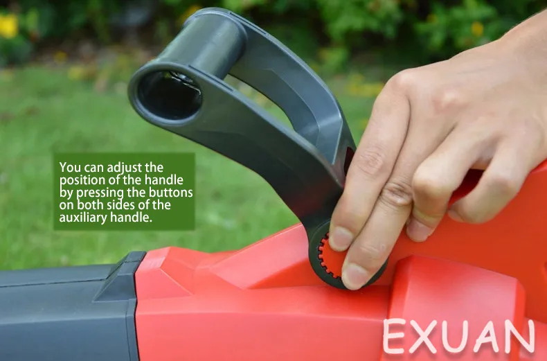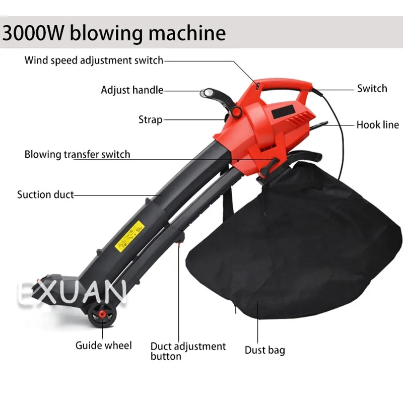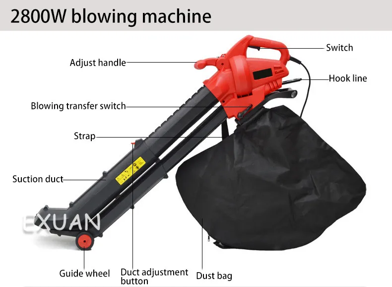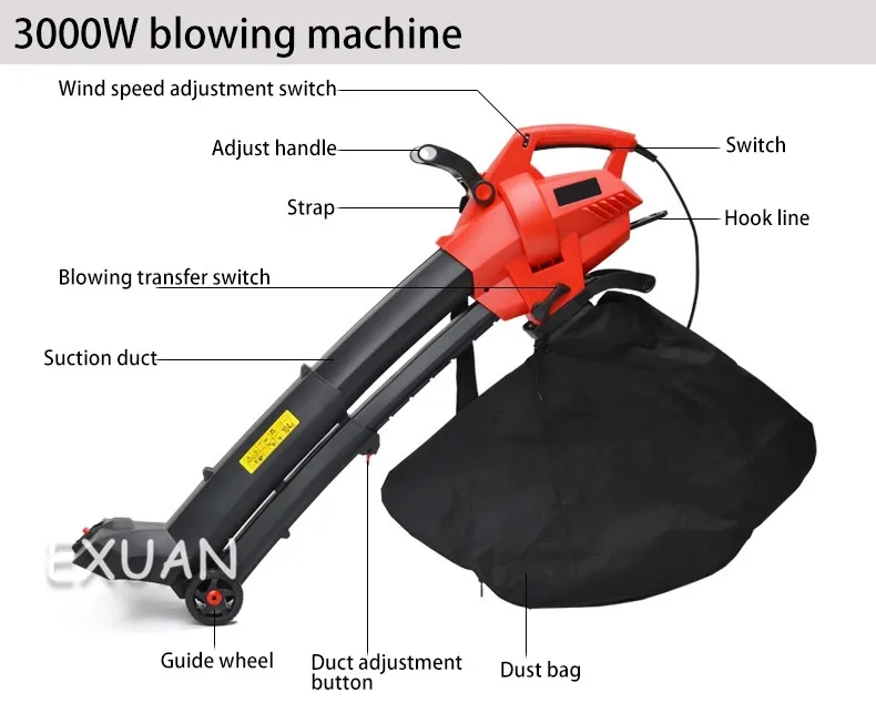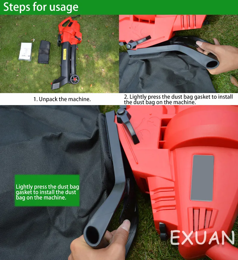 Модель продукта: ES-V3002 электрическая выдувная машина Область применения: 2000 ㎡ Тип двигателя: медный провод Скорость мощности: 3000 Вт 16500 об/мин Максимальная скорость ветра: 275 км/ч Коэффициент дробления листьев: 15:1 Емкость мешка для пыли: 45 л Функция продукта: съемная очистка, металлическое лезвие, пылеуловитель, регулируемая высота трубы Модель продукта: ES-V2802 электрическая выдувная машина Область применения: 2000 ㎡ Тип двигателя: медный провод Скорость мощности: 2800 Вт 14000 об/мин Максимальная скорость ветра: 275 км/ч Коэффициент дробления листьев: 10:1 Емкость мешка для пыли: 45 л Функция продукта: выдувание и дробление листьев, регулируемая высота выдувания соломы Перед использованием: (1) надевайте Прочные ботинки, очки и защитные перчатки. (2) Выберите камни, тканевые полоски, полиэтиленовые пакеты, веревку, железную проволоку и другие мусор в траве. (3) Убедитесь, что детали не свободны, и машина может нормально работать. (4) Подключите шнур питания и повесьте удлинитель питания на крючок. При использовании: (1) вопросы безопасности: используйте машину в среде с хорошим источником светильник. Не используйте устройство для поглощения слишком влажных листьев. Не используйте машину без мешка для пыли. Не выдувайте твердые предметы. Не вставляйте всасывающий порт машины в отходы, чтобы не блокировать выдувную трубку и снизить эффективность работы машины. Не позволяйте детям и рукам управлять машиной; Не бегайте и не поднимайте машину; Держите руки и ноги вдали от дна; Прохожие должны быть расположены в 8 метрах от рабочей зоны; при резке посторонних предметов, когда машина не работает, И когда машина вибрирует аномально отключите штепсельную вилку немедленно. (2) Метод запуска: после подключения источника питания нажмите выключатель питания, чтобы запустить машину. Когда выключатель питания выключен, машина останавливается. (3) преобразование всасывания: Переключите кнопку преобразования всасывания выдувания, чтобы выбрать режим работы выдувания или всасывания. (4) регулировка скорости ветра: Переключение переключателя регулировки скорости ветра для выбора требуемой скорости ветра. Есть 6 скоростей передачи на выбор. (5) разборка и очистка: поверните ручку на корпусе ботинка, чтобы очистить мусор, который завернут или застревают внутри машины. После использования: (1) остановите работу: Отключите источник питания, пока машина полностью не остановится. (2) для очистки машины: пустого мешка для сбора пыли избегать пожаров, вызванных чрезмерным распад сломанной травы. Вы можете высушить краску водой и использовать снова. Если мешок для пыли поврежден, его следует немедленно заменить. Очистите машину сухой тканью, чтобы предотвратить попадание капель воды в машину.