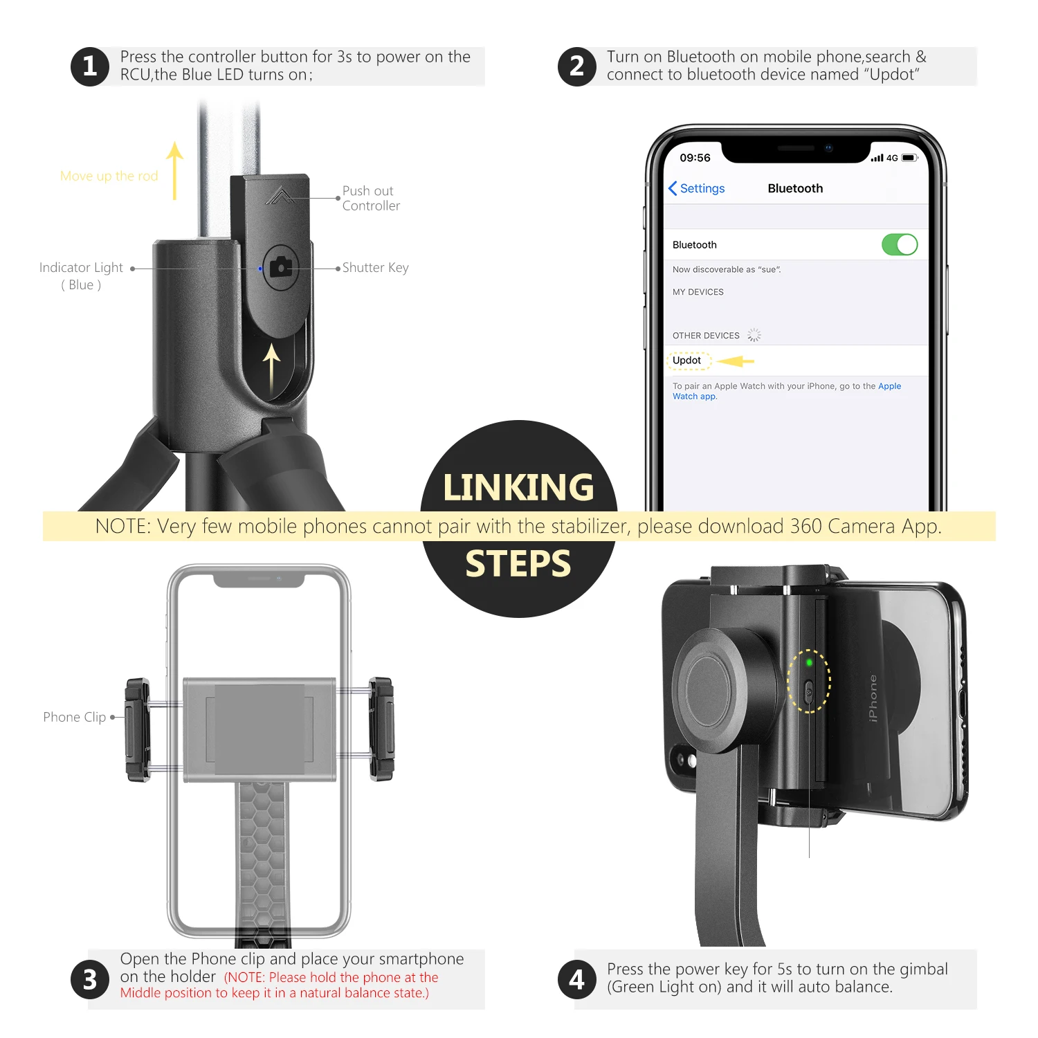 Примечание 1. Очень немногие беспроводные дистанционные устройства мобильного телефона не могут быть сопряжены со стабилизатором hanheld, загрузите приложение 360 Camera и следуйте инструкциям по использованию.