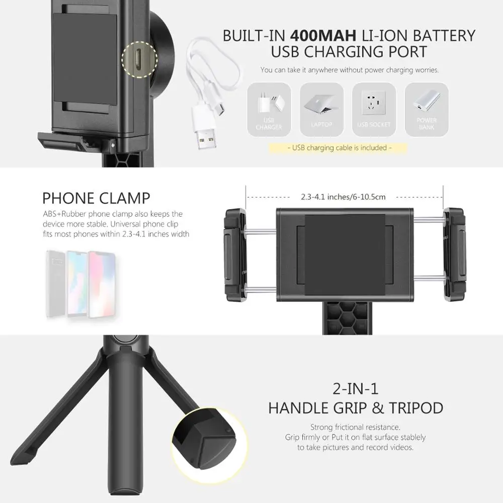 Рукоятка + Выдвижная палка + штатив: Может использоваться в качестве рукоятки и может быть выдвижной, чтобы быть селфи палкой с 4 секциями из алюминиевого сплава (19-67 см/ 7,5-26,4 дюйма); Когда вы открываете захват, он становится штативом, чтобы его можно было разместить на любой плоской поверхности, нескользящая резиновая обработка делает его более Стабильная