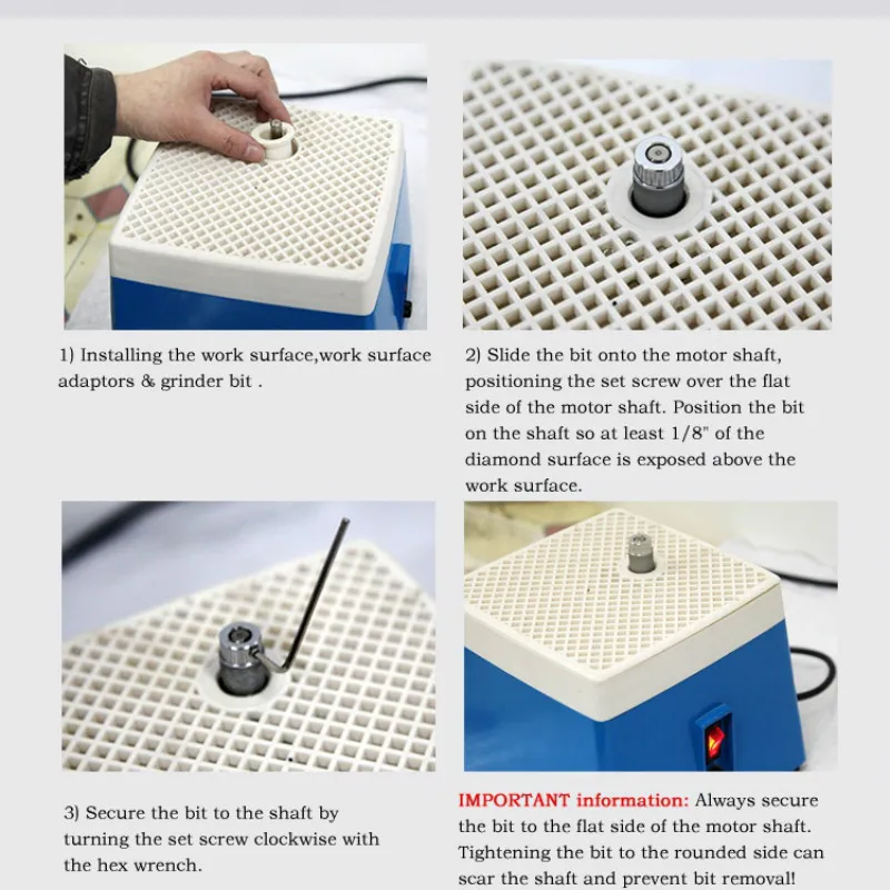 2.Шлифовальный круг установлен на валу двигателя, положение крепежного винта выше, чем вал двигателя. Положение шлифовального круга на валу.По крайней мере1/8"Алмаз частично разоблачен на столе.
