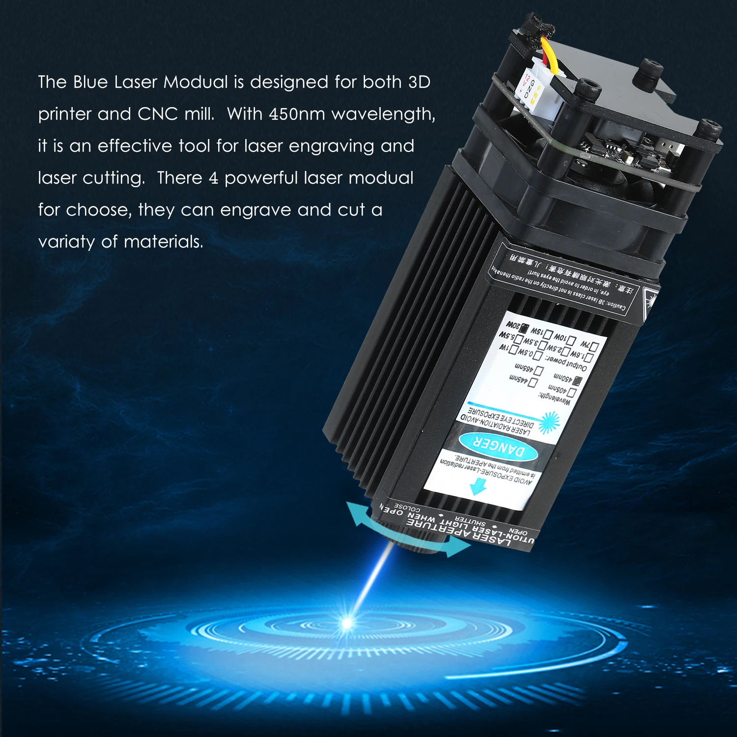 Синий лазер Modual предназначен как для 3D-принтера, так и для станка с ЧПУ. С длиной волны 450нм, это эффективный инструмент для лазерной гравировки и лазерной резки. Есть 4 мощных лазера modual на выбор, они могут гравировать и резать различные материалы.
