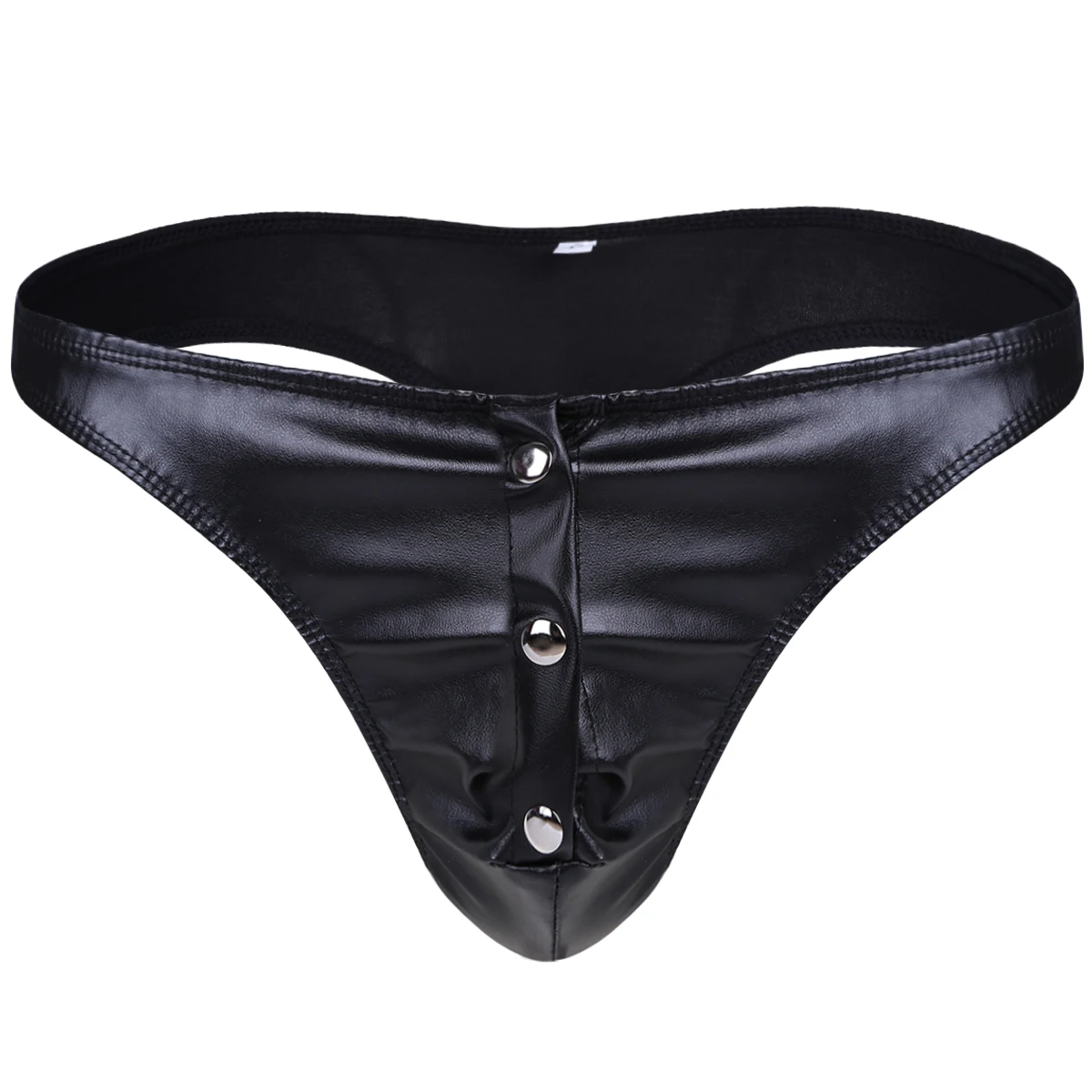 Мужское нижнее белье из искусственной кожи, трусики, бикини, мужские сексуальные латексные Т-образные стринги с кнопками для украшения